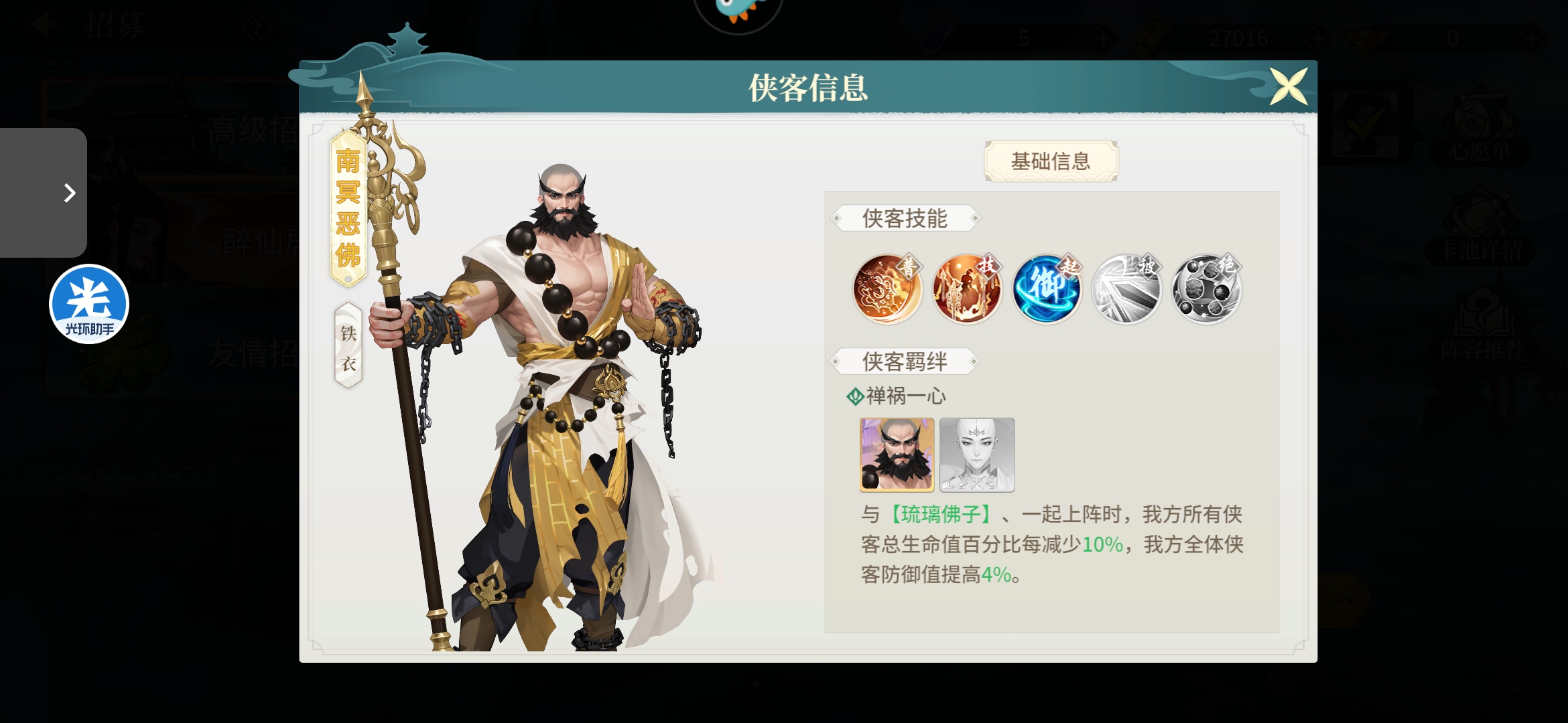 防御型坦克,南冥恶佛绝技可以为低于半血友方施加护盾值,技能本身触发难度较苛刻,但搭配琉璃佛子主动换血转盾,双重护盾保护变相提高阵容坦度,同时南冥恶佛尘世免死可以提高阵容容错率,南冥恶佛+琉璃佛子的搭配适合坦度较低的阵容,可以大幅提高阵容坦度