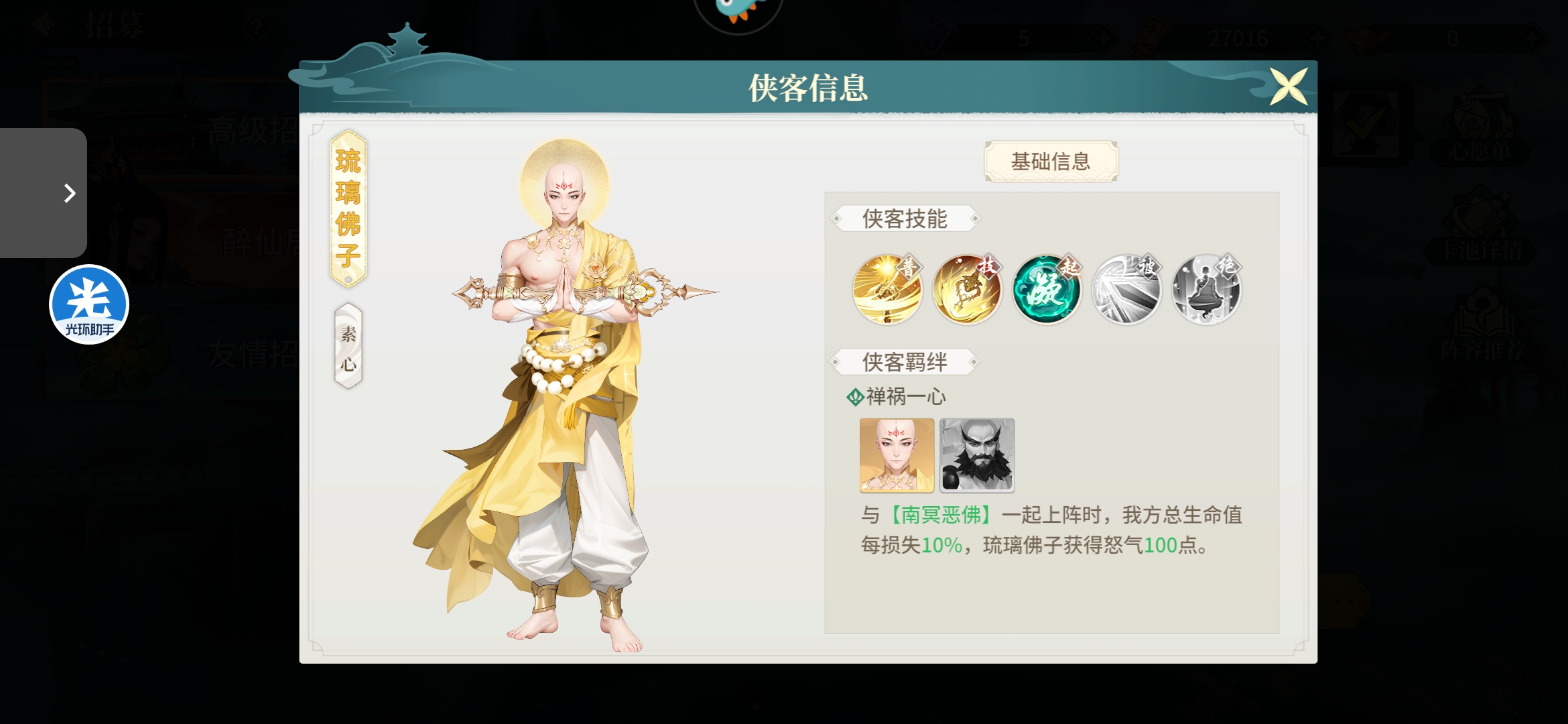 保护型辅助,琉璃佛子技能效果并不差,无常状态时其他友方可以分摊30%伤害+濒死免疫致密伤害可以保护武将生存,但无常状态仅能触发一个且针对血量最低单位,阵容未成型前容易造成主力消耗血量保护光环,阵容成型后除非自身阵容坦度不高配合南冥恶佛,否则不如治疗型奶妈更实在
