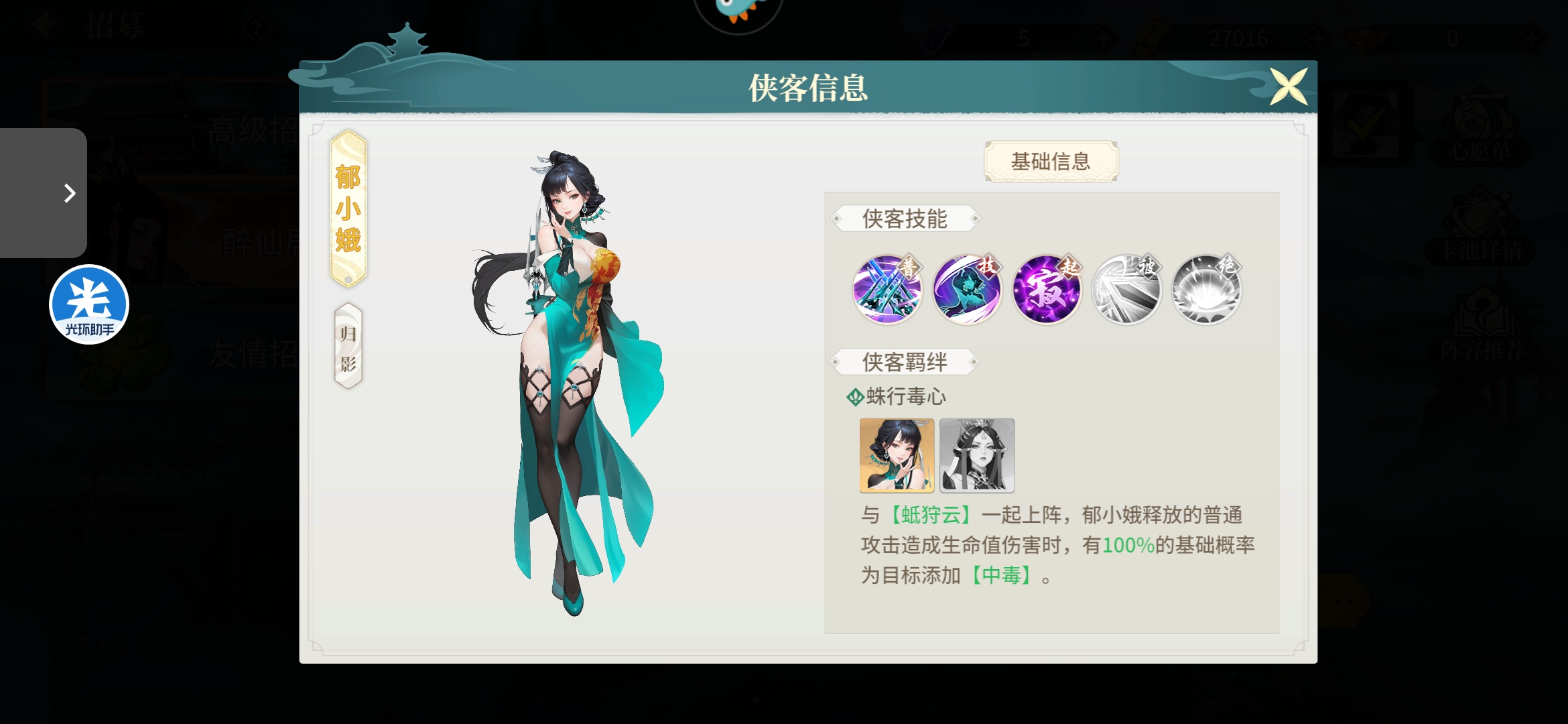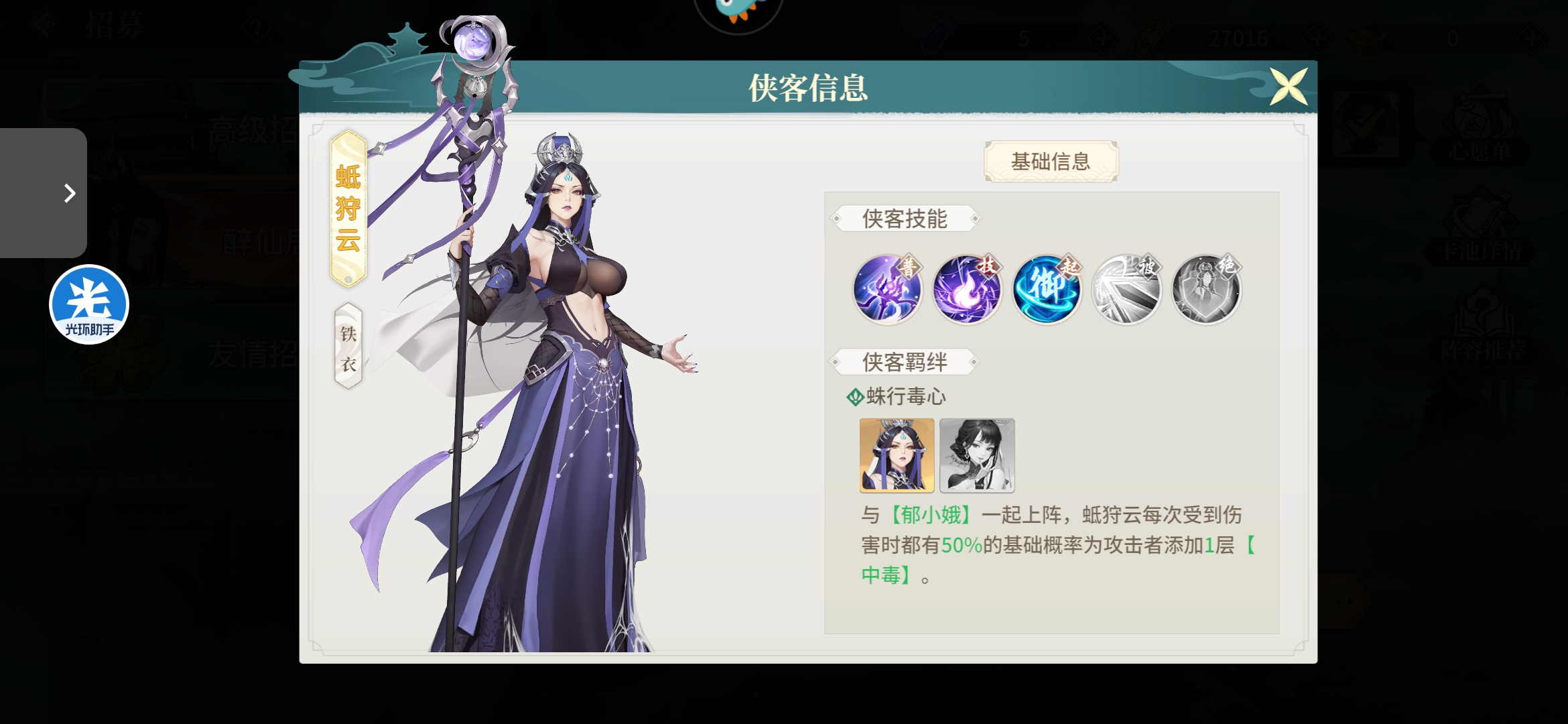 防御辅助型英雄,兼顾叠毒伤害和生存,适合中毒阵容快速叠毒,蚔狩云用于超强的群体光环效果,绝技缠丝护受击概率叠毒可以提高己方阵容快速叠毒能力,同时敌方释放绝技可以出发一次毒爆效果,可以弥补阵容输出,此外罗锦友方回血+自身回复可以提高阵容坦度,保证阵容续航