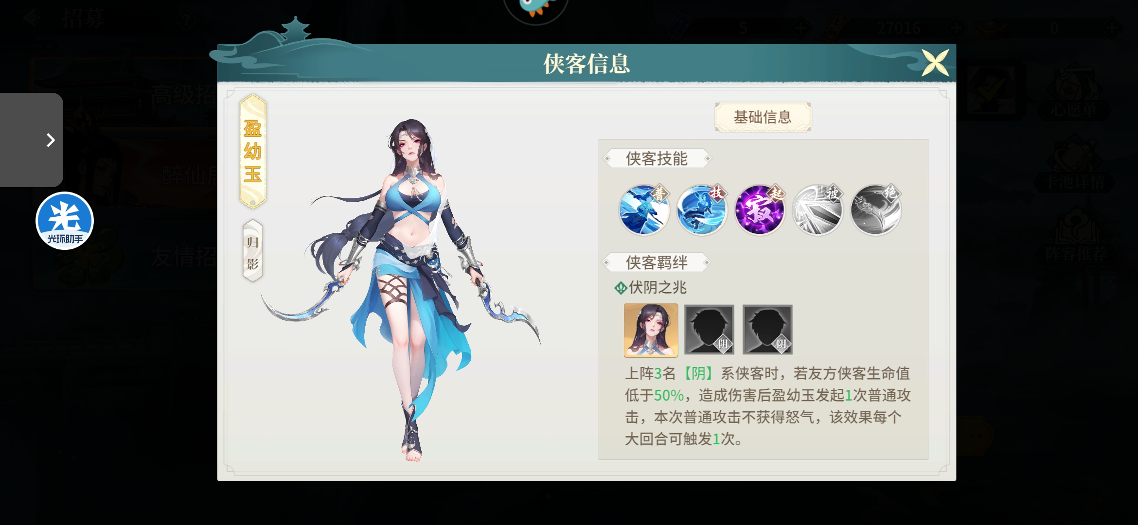 单体爆发英雄,门槛相对较高,盈幼玉羽刺可叠加增伤能力配合自身绝技拥有高额的技能系数和额外增伤收割能力较强,但绝世品质以下的盈幼玉更换目标重新叠加羽刺状态,前期叠加增益难度较大,启动相对较慢,非氪金玩家仅推荐过渡,不建议升星