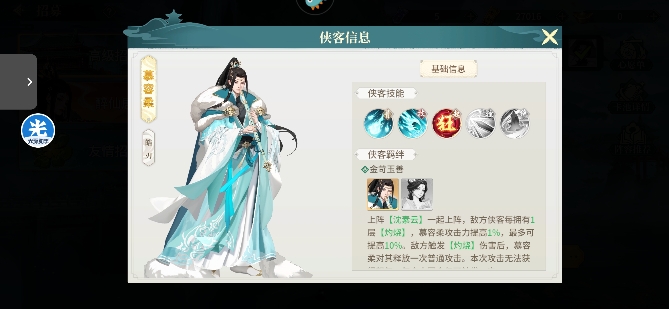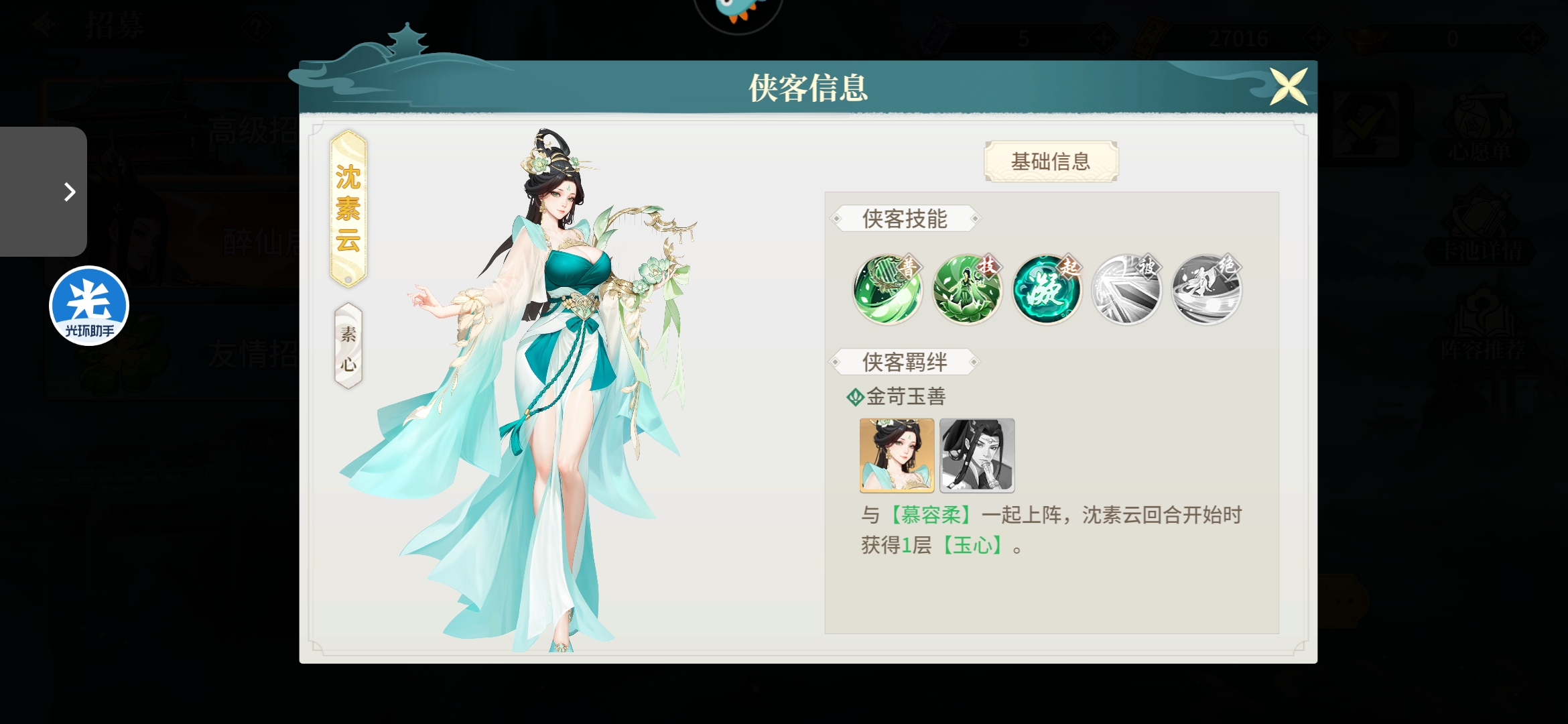 灼烧型辅助,沈素云兼顾治疗和叠加灼烧能力,沈素云不仅拥有主动治疗,回合外依旧可以治疗,极大程度保证阵容续航能力,同时沈素云拥有超强灼烧能力,敌方累计受到灼烧伤害可以获得一层玉心,消耗玉心概率使敌方全体获得灼烧,相辅相成快速铺散灼烧状态,可以帮助慕容柔快速叠加5层灼烧,加速领域启动速度