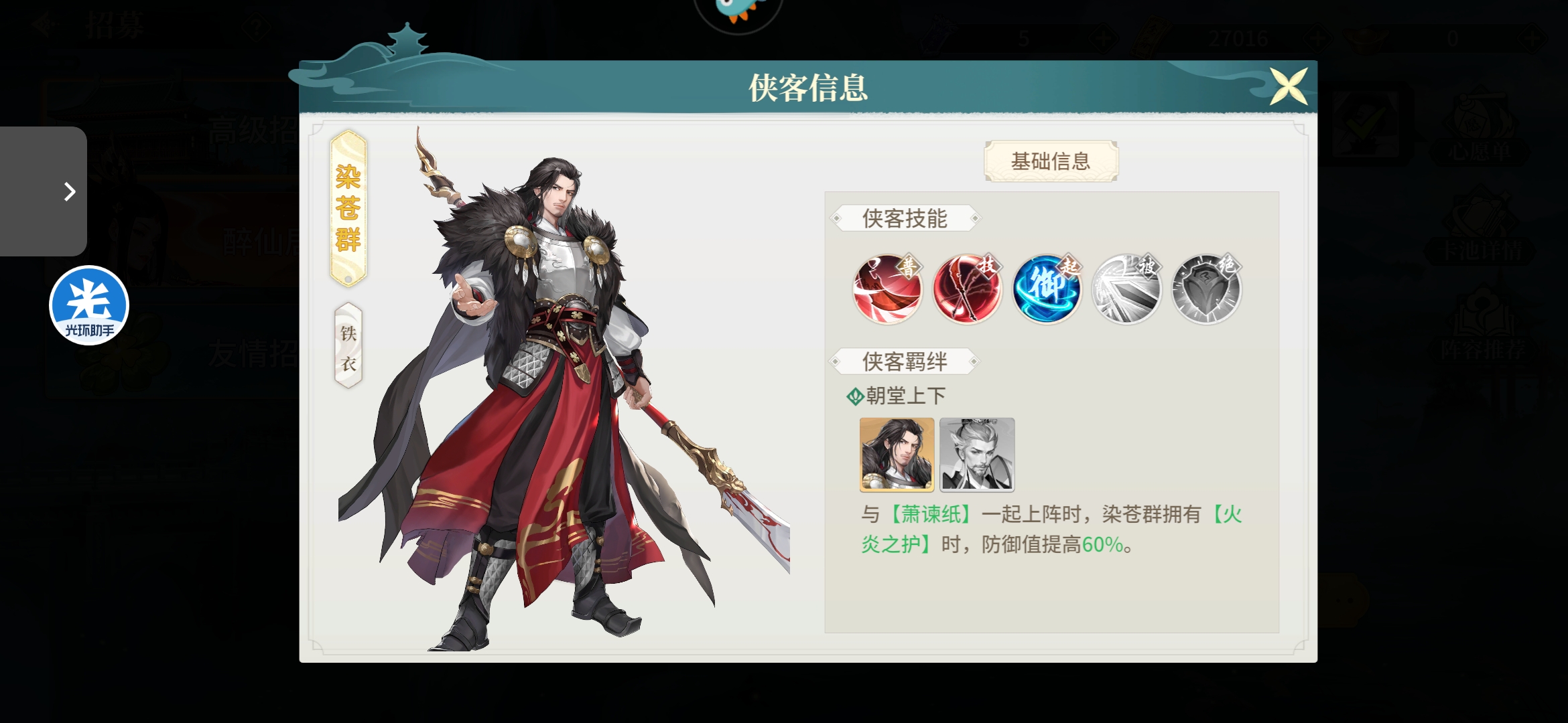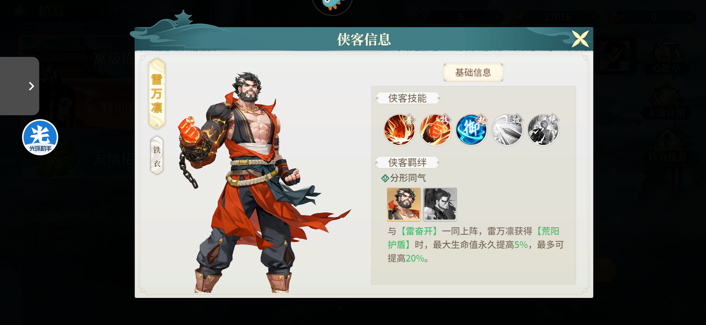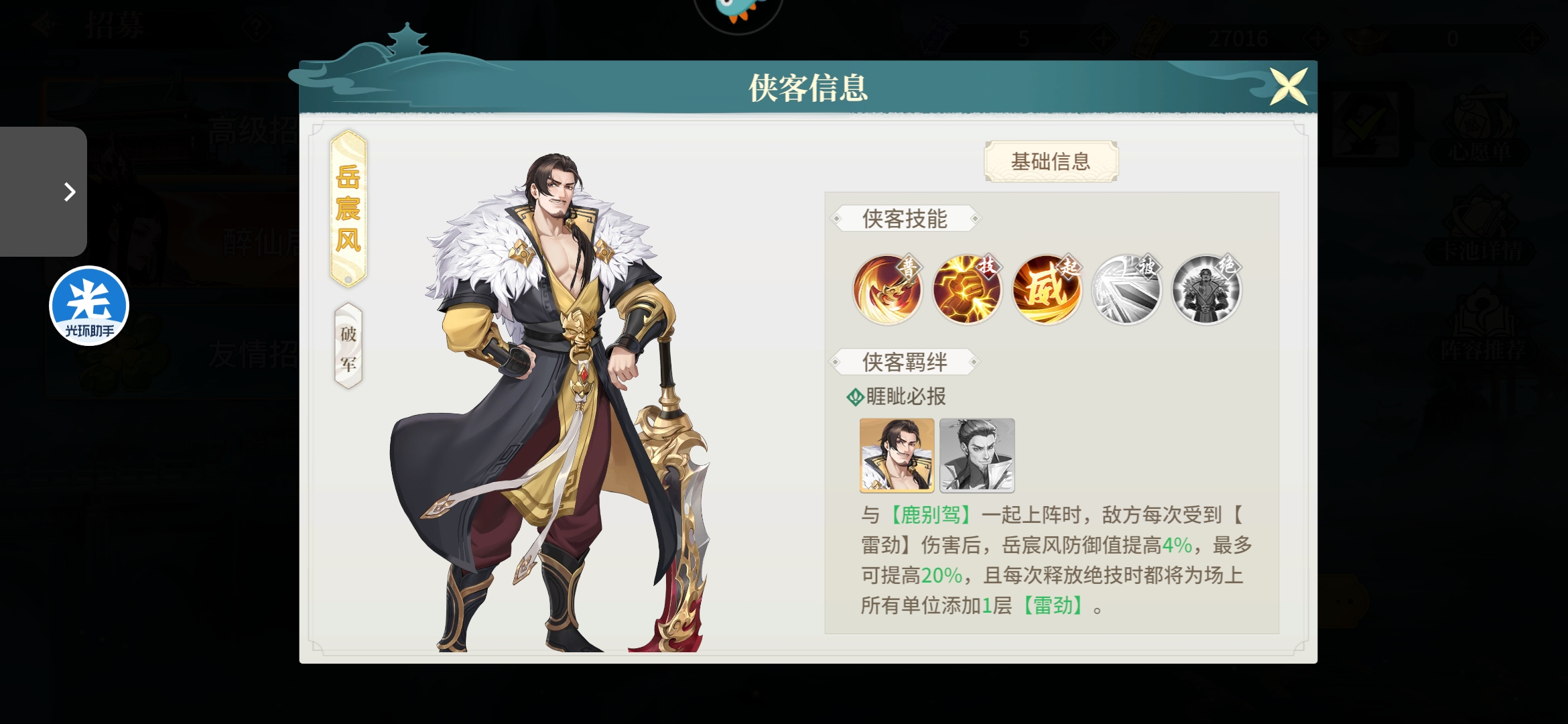 输出型武将,岳宸风主要利用雷劲叠加造成真实伤害,但友方也会受到雷劲伤害,虽然后续会附加雷丹增怒,但伤敌一千自损八百,输出上比不过其他侠客,增怒上不如上官妙语增怒更直接,不推荐