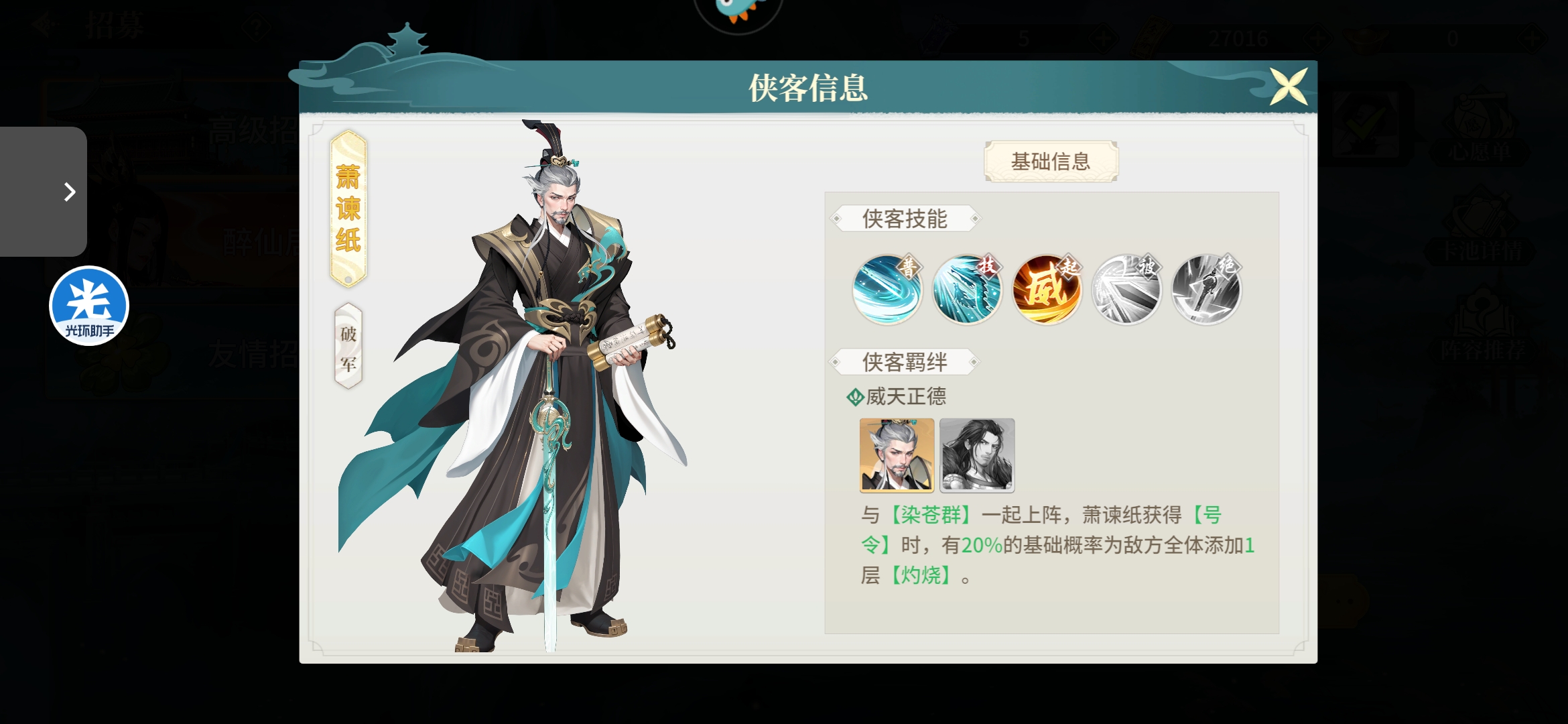 功能型武将,萧谏纸拥有超强再动机制,叠满五层号令后可以使己方主力获得额外回合,技能机制不差但触发难度较大,号令即使满配也需要2-3回合后叠满,低星时则需要4回合,而作为光环很难坚持到四回合以上,投入成本相对较高,不如双核培养实战