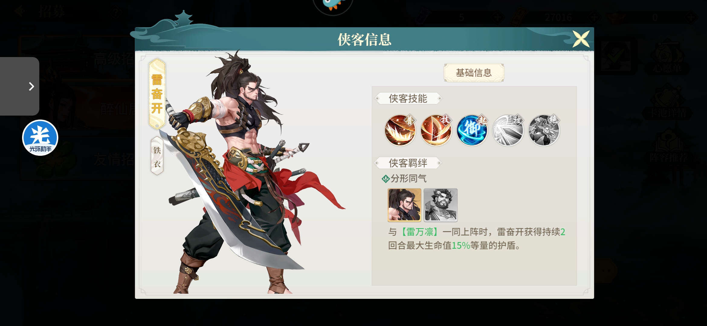 控制型坦克,雷奋开核心在于绝技前两排高概率嘲讽,可以有效打乱敌方布局,但自身残血时每回合还需要损失血量为友方增加护盾值机制略有鸡肋,本身嘲讽强制敌方普攻自身,再主动减血反而增加自身阵亡风险