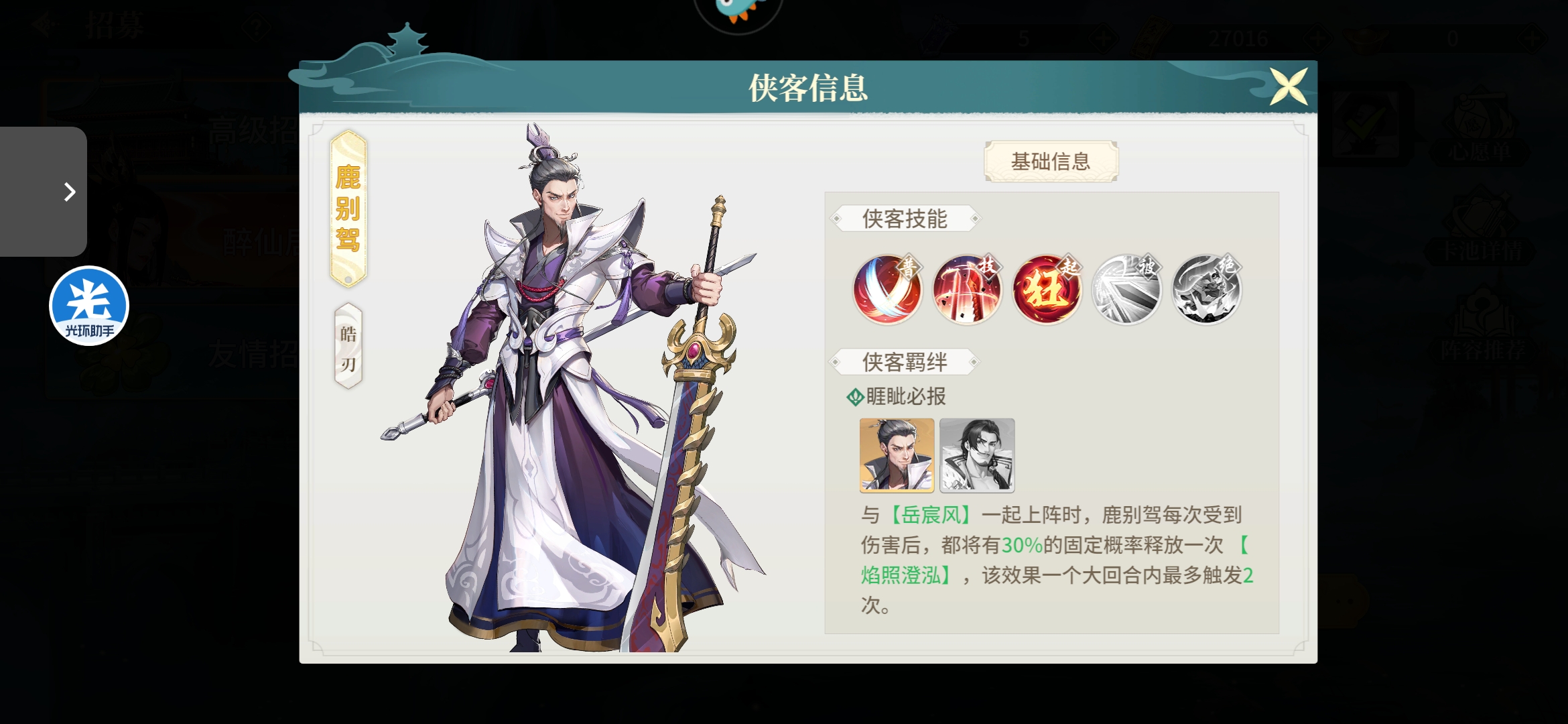 输出型武将,鹿别驾拥有多段输出,损失血量/护盾+获得怒气+受击+绝技均拥有多段伤害,但该伤害目标为后排随机目标,很容易使伤害分散,容错率相对较低
