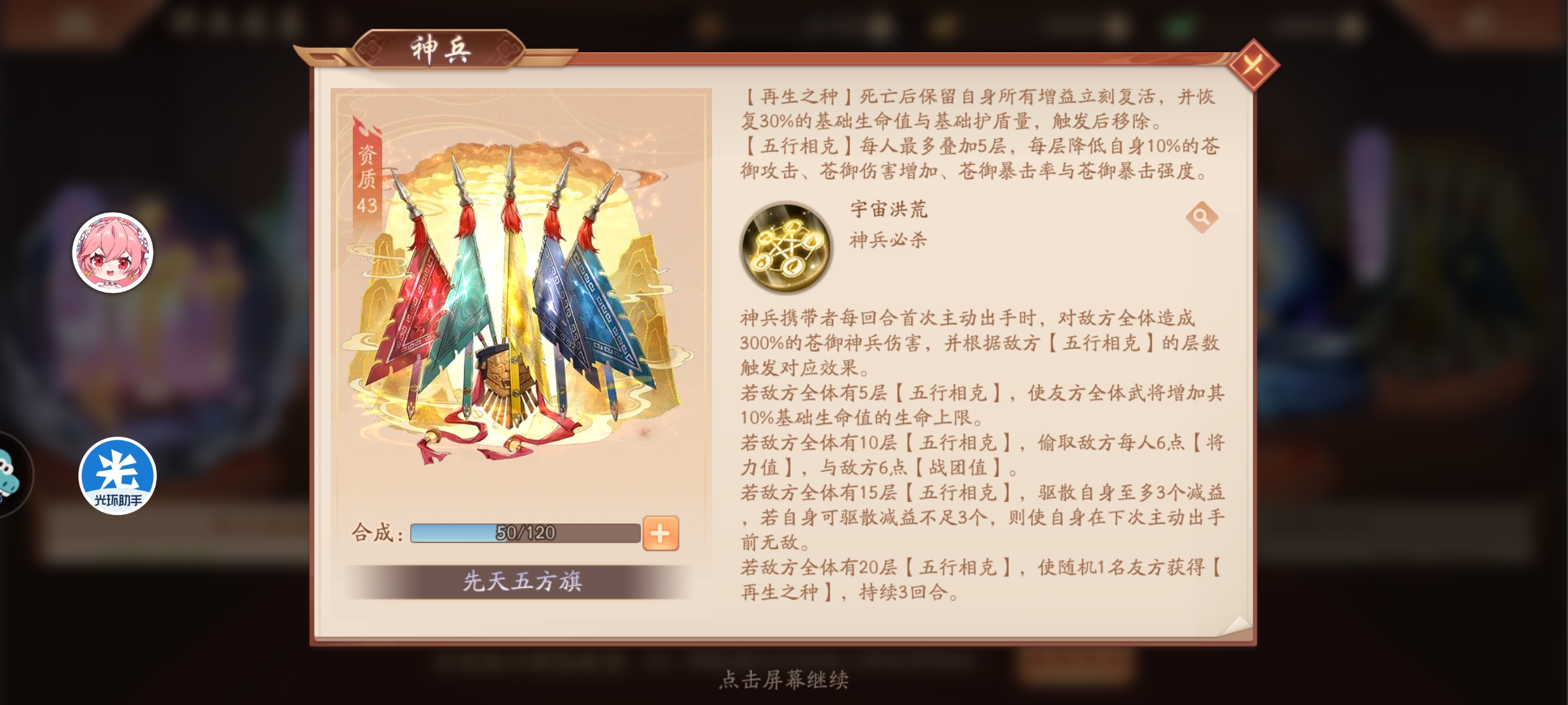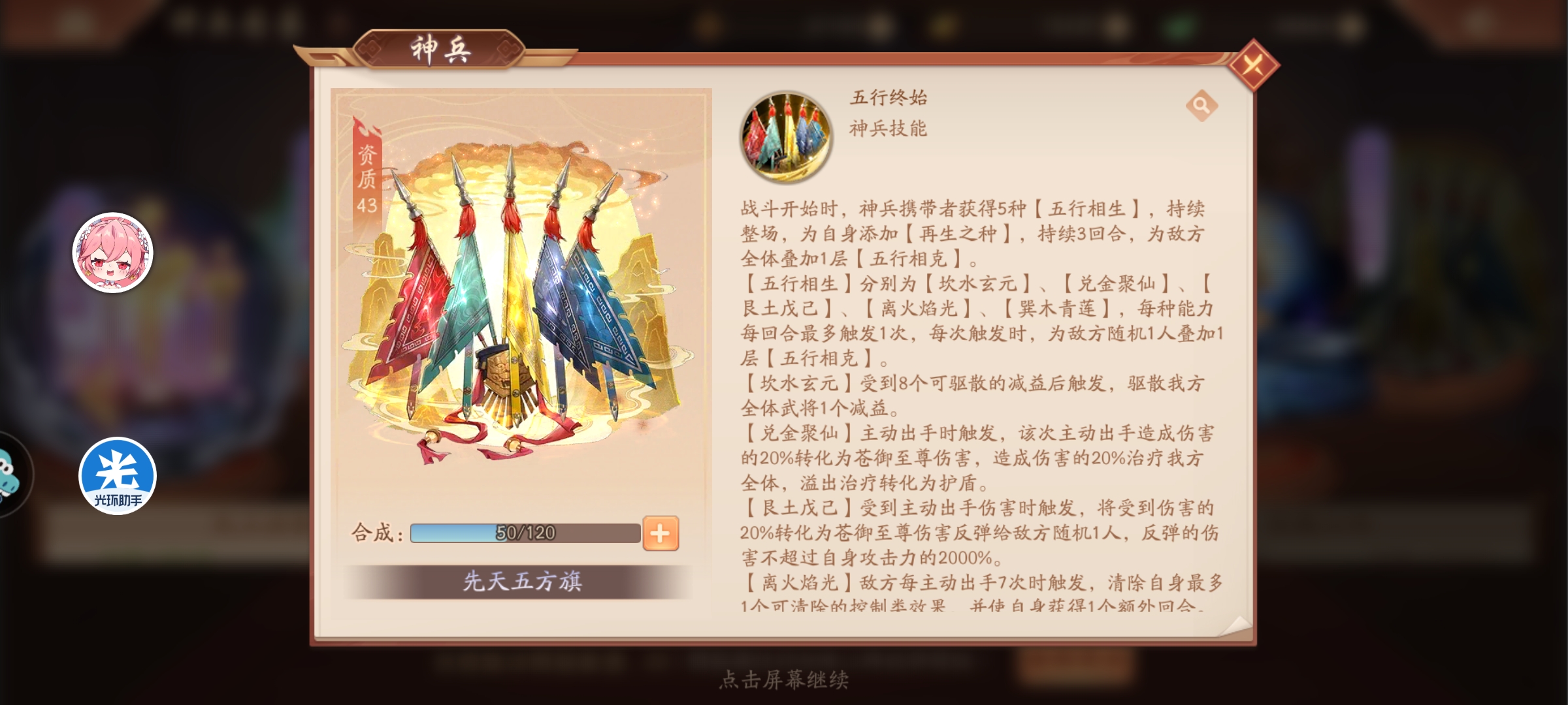 开局时,神兵携带者获得5种五行相生持续整场。五行相生每种能力每回合触发一次,每触发一次为敌随机1人加1层五行相克。