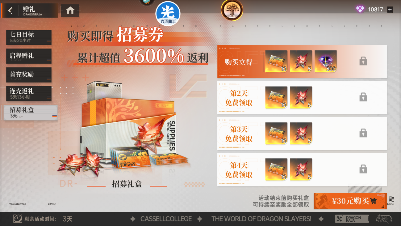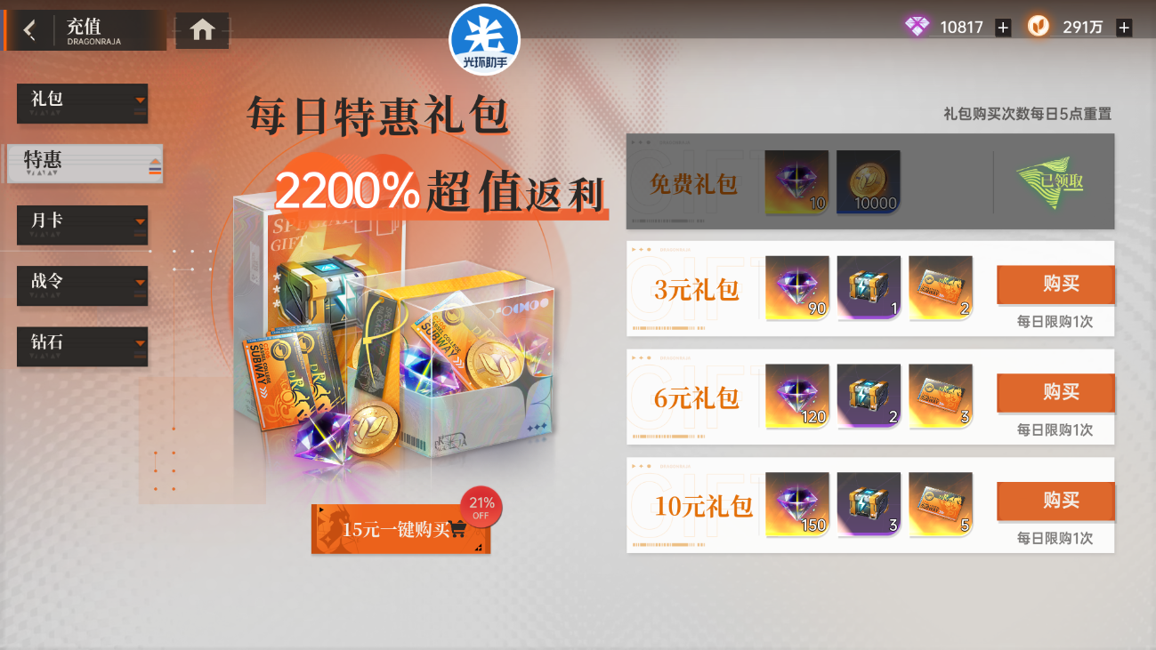 【每日特惠礼包】(15元)360钻石+6箱体力+10抽