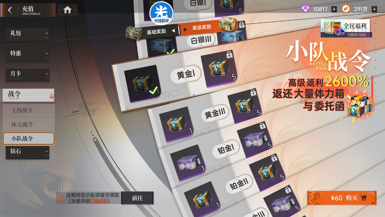小队战令:45箱体力+10皓英委托书+15铂金委托书+5白银委托书