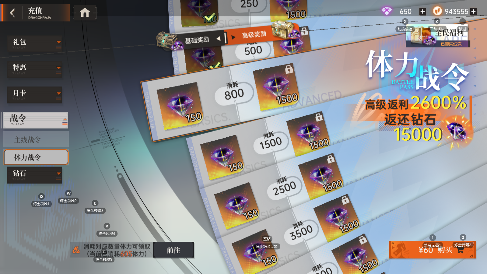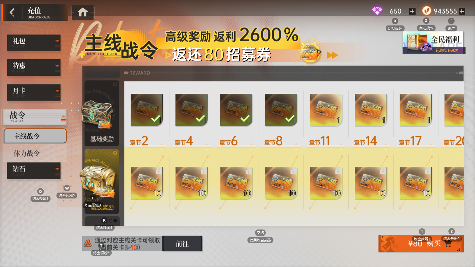 里面有两种战令选择,一种是主线战令(打完多少多少章就给多少多少抽奖卷);另一种呢是体力战令(消耗多少多少体力给多少多少钻石)。