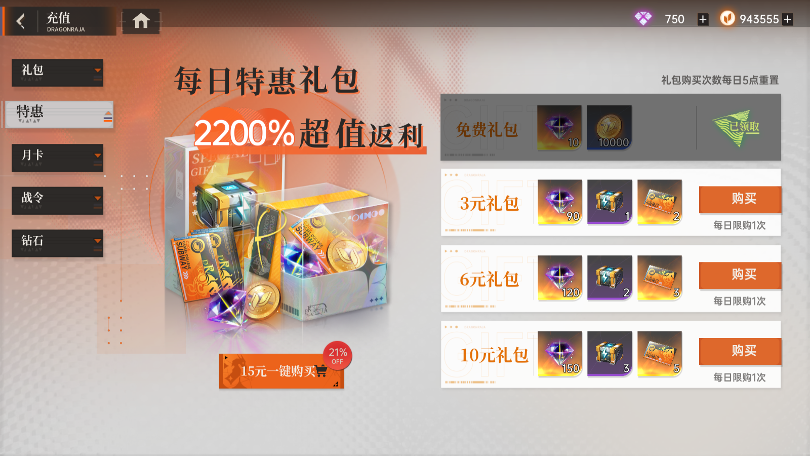在月卡上面有一个月卡特惠礼包,里面有四个档次:免费;3元;6元;10元。而如果我们全都要呢就只用花15块钱就能全部带回家,虽然给的不是很多,但对的起这个价位,并且如果我们连续买这个特惠礼包买6天就会有一个又白又大的惊喜。就是下面这个!!!