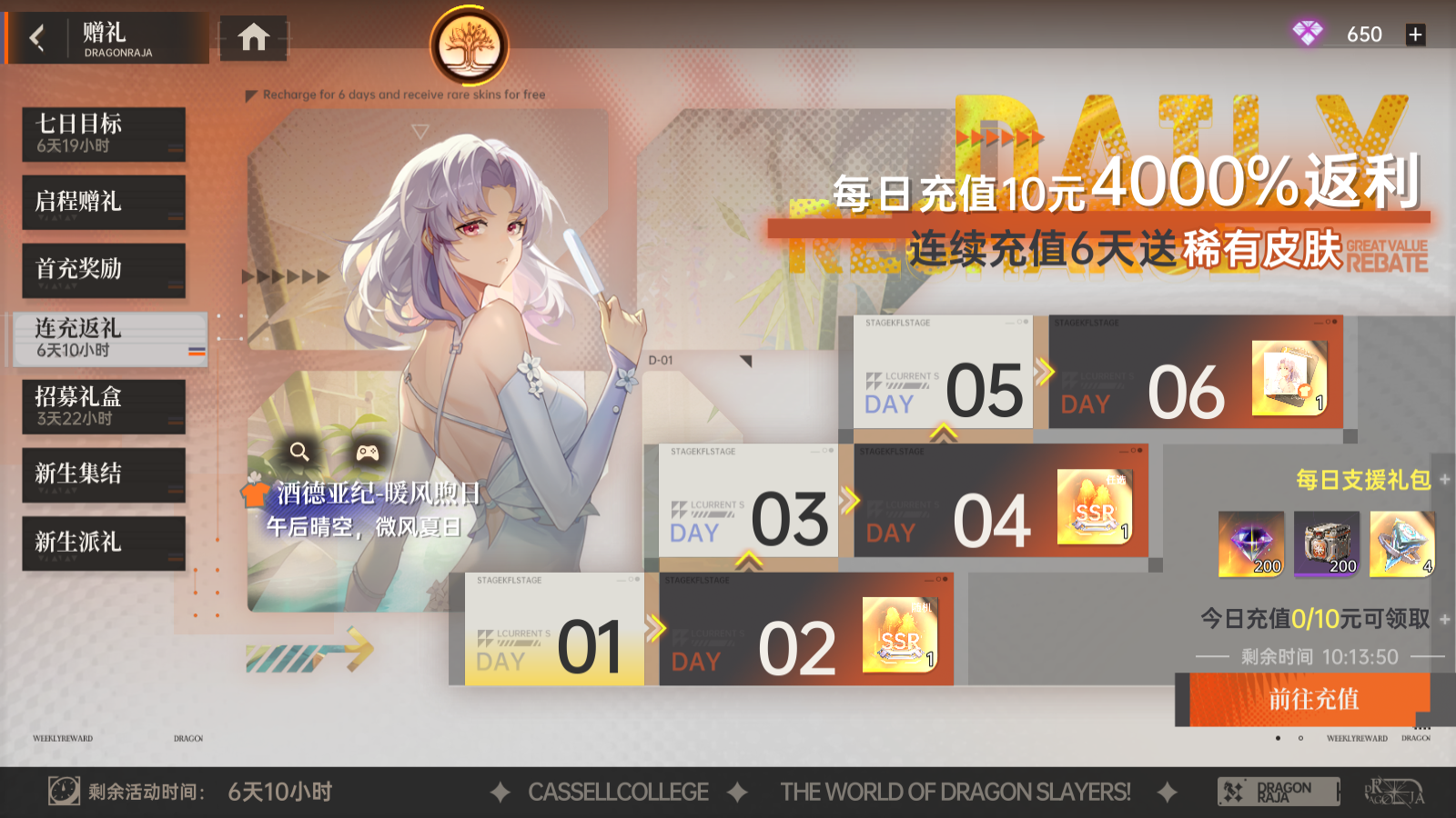 这个连冲返礼只用将每天的特惠礼包买了就行,如果想再剩点的,可以就只买10块钱的档位,买满6天就可以了,这个兄弟们我是是真的推荐去弄到的,不仅可以获得随机和任选SSR各一个,最主要的是原本应该卖98的皮肤现在只用60就可以搞到了。