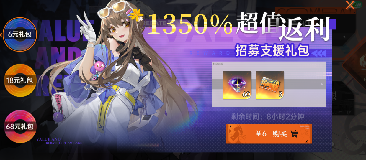 差不多打到第8章的时候(具体是哪就忘了,反正是前面解锁的礼包),一个是有三个档位的超值返利的礼包,分别是6元档(60+3)、18元档(180+7)、68元档(680+22)。