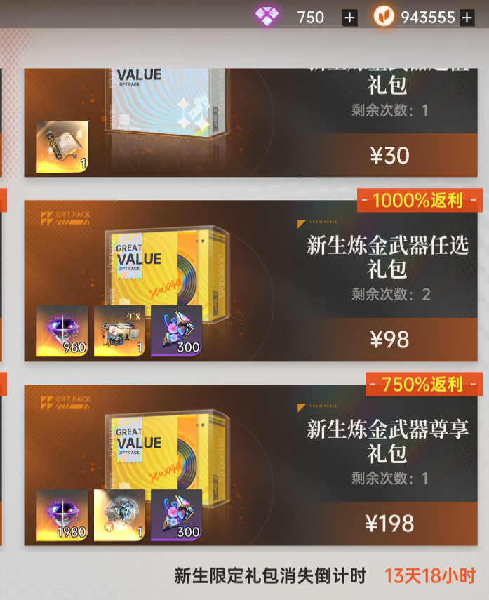 6.剩下的就是充值里常规礼包了。里面也有两种礼包任君选择。其中新生限定里面的礼包有三个礼包的性价比是比较高的,分别是30元、98元和198元的档位。这几个档位买了都是可以直接再多一个炼金武器出来的,非常划算。