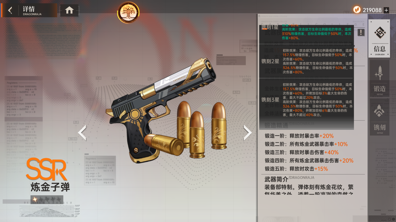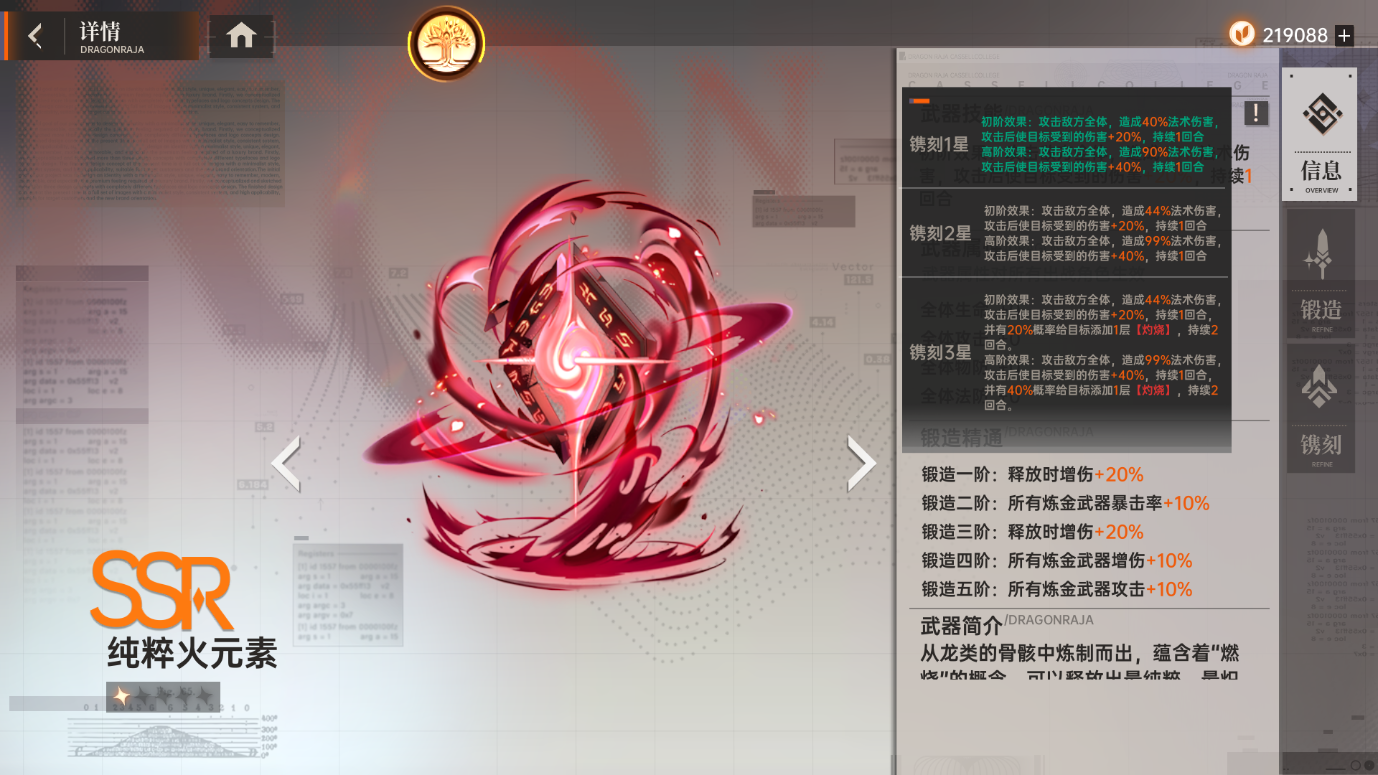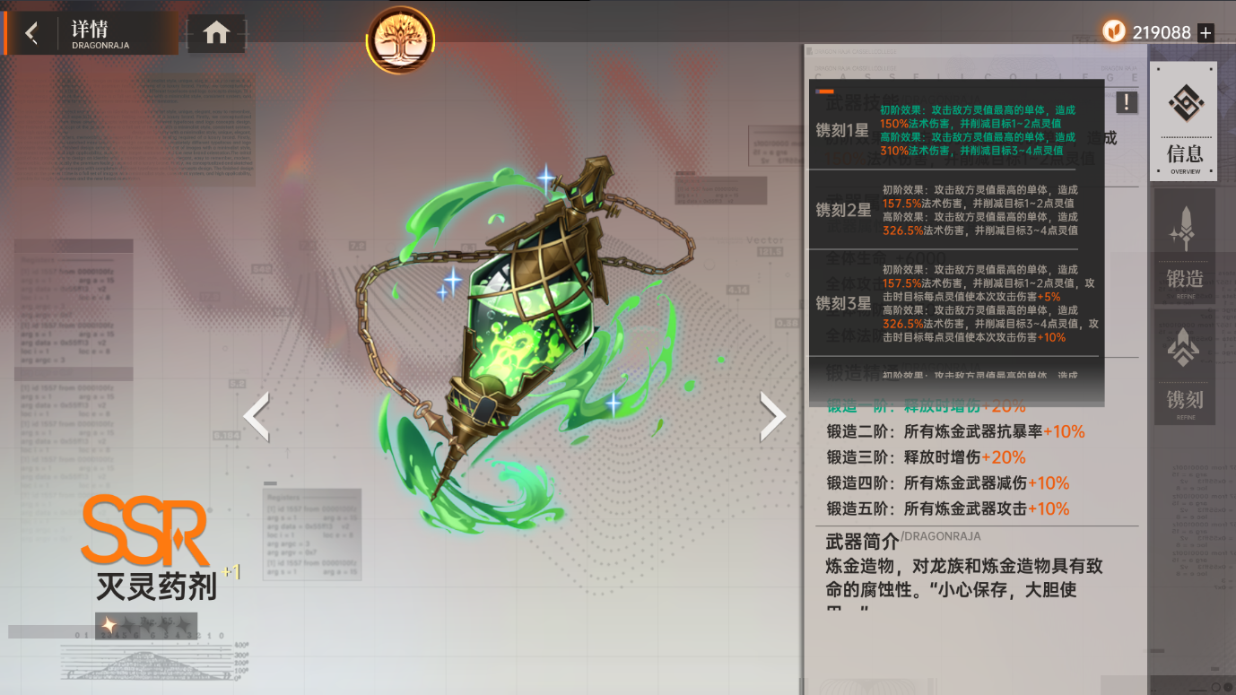 技能讲解:造成的伤害不算高,最主要的是使敌方受到伤害提高20%(高阶是40%),也是炼金武器中为数不多可以稳定提高队友伤害的炼金武器了,升到3星之后还会在多一层【灼烧】效果,非常契合楚子航的灼烧队,也可以用来给其他队伍提提伤害。