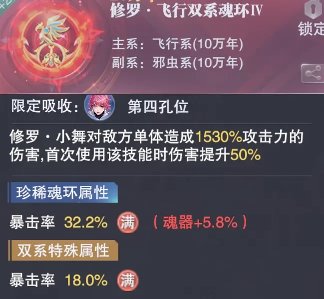 然后是SP小舞的双系魂环,她的4技能双系都是加的我们所选择的属性,但2技能双系则会有一个最终伤害的提升,总的来讲,SP小舞的双系魂环依然是为PVP服务的,第一是PVP中我们需要通过双系魂环的优势来抢属性,第二则是长图或活动副本中双系魂环给到SP小舞的提升并不算很大,因此还不如直接给PVP来用,所以在拿不满的情况下,SP小舞的两个双系魂环都可以优先选择飞行系的魂环。