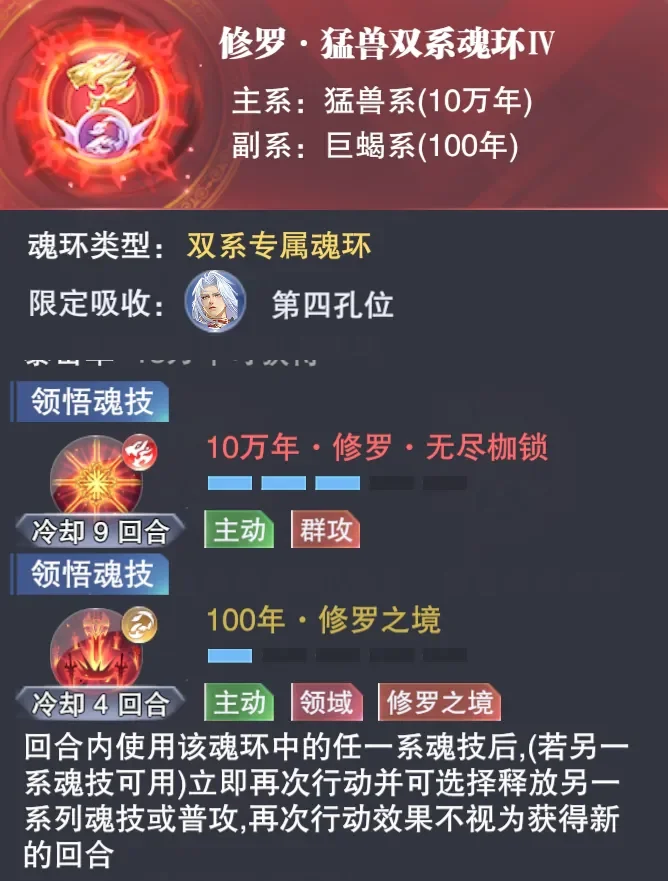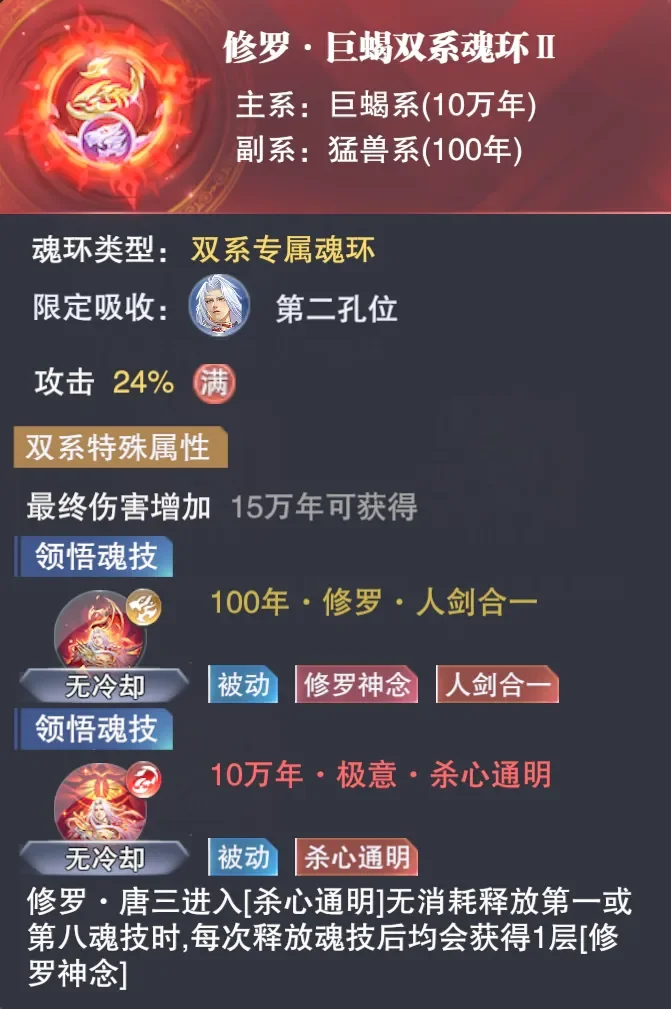 然后是SP修三的双系,其中4技能双系可以通过月兔活动获取,兑换6个的话最低门槛成本门槛为5.1W兑换币,其中这个魂环的双属性都是加的我们所选的属性,因此从PVP需要竞争全场爆伤最高的角度来分析,SP修三的4系双系魂环是可以优先选择更偏PVP的巨蟹系的。