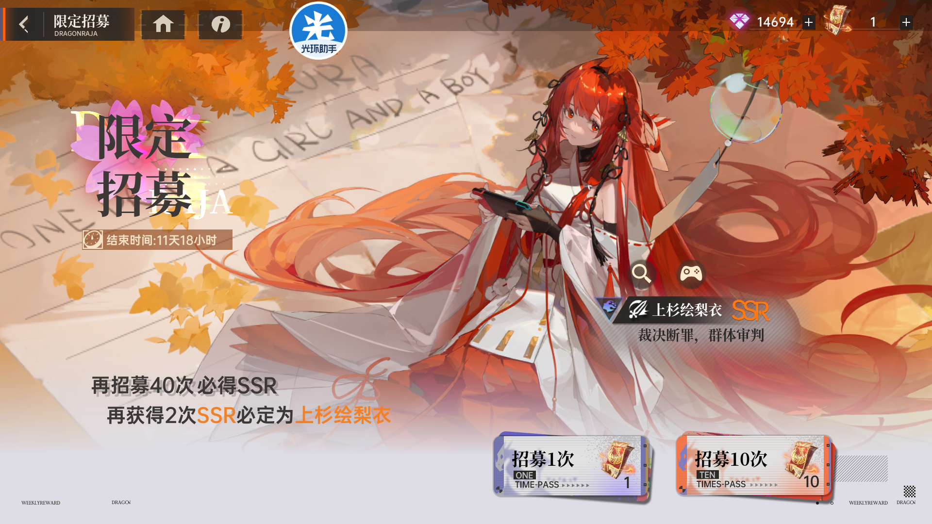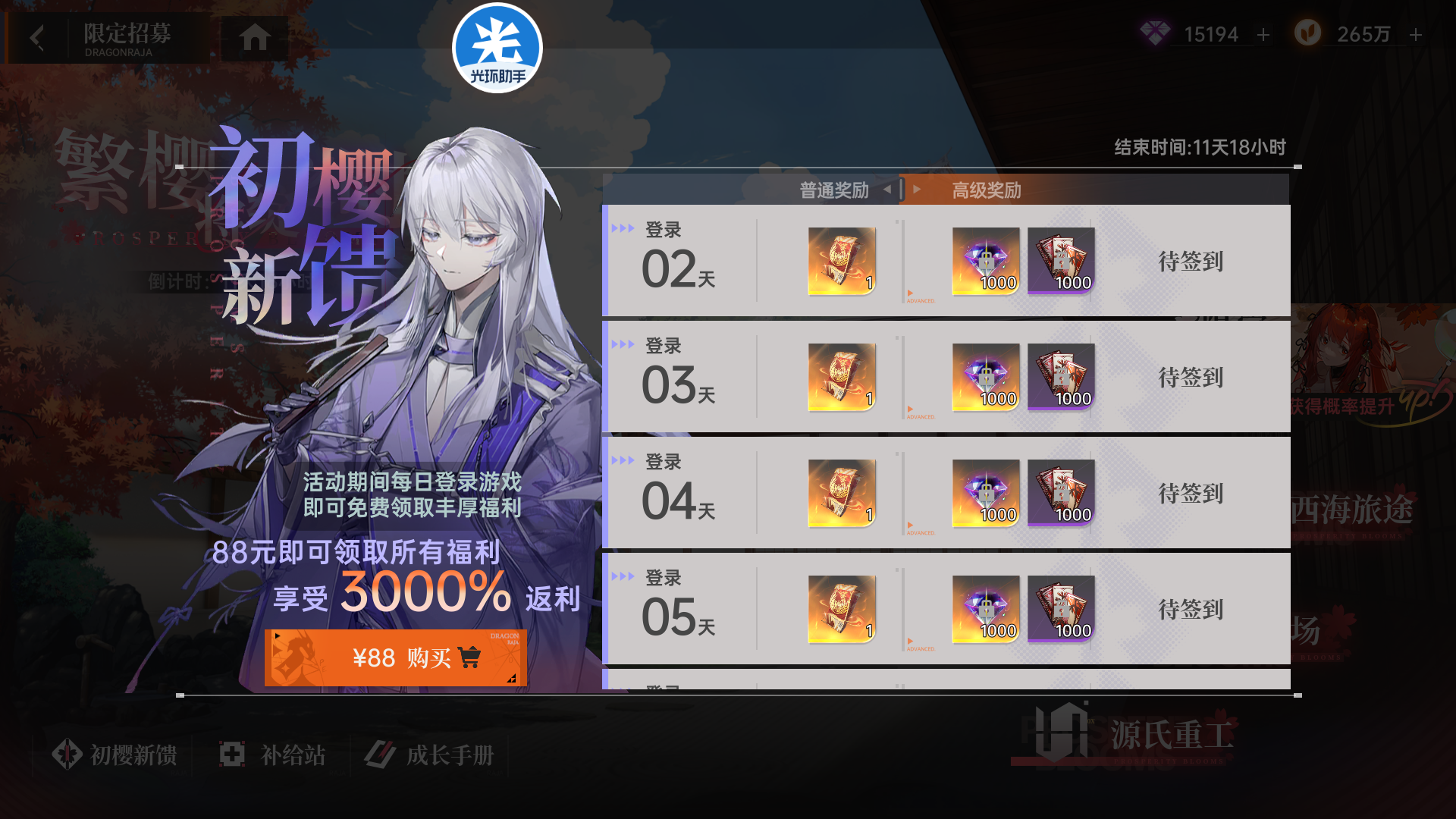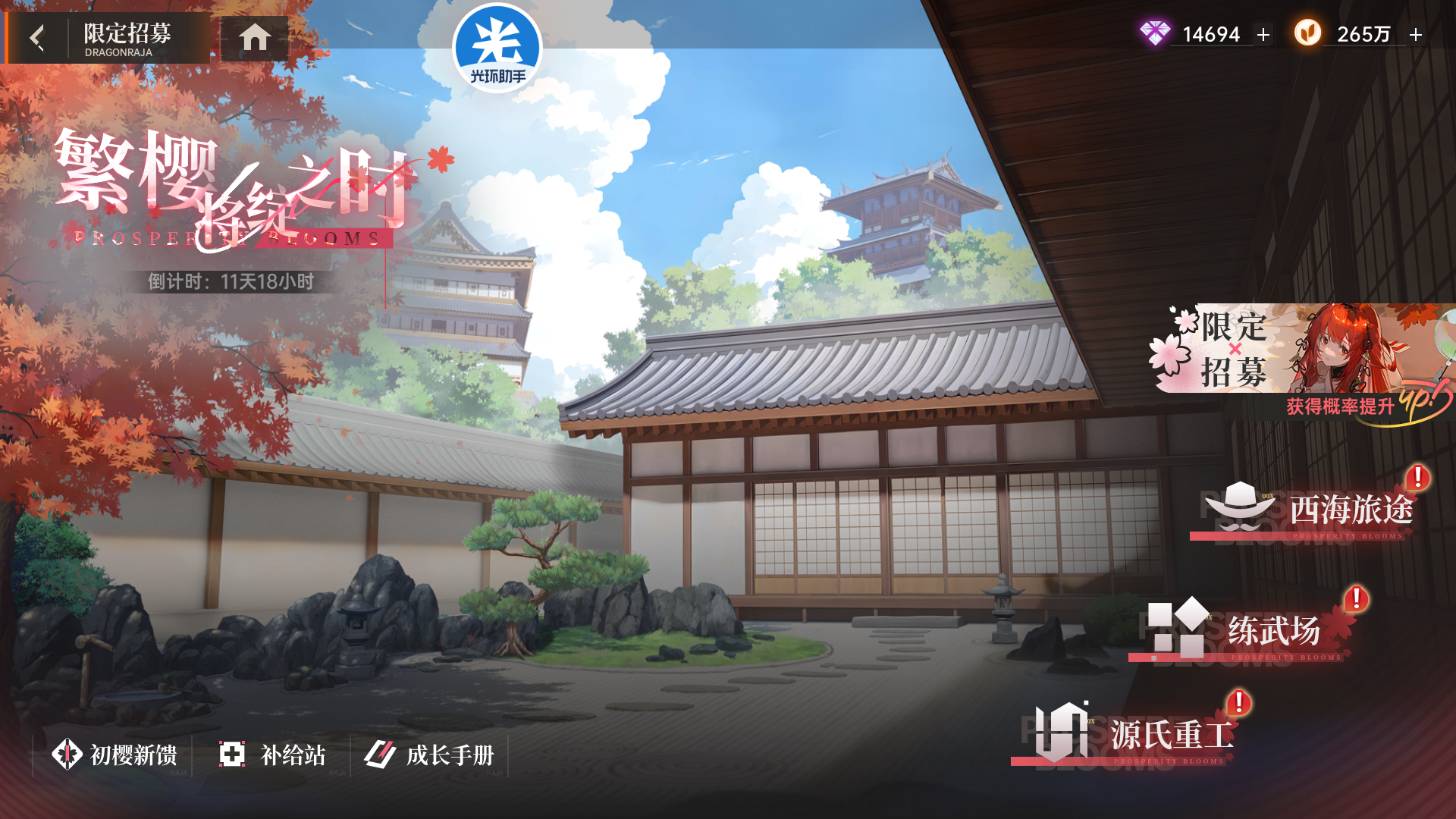 「繁樱将绽之时」活动时间为9月15日至9月27日。活动中,玩家有机会通过限定招募获取强力的SSR角色——上杉绘梨衣,以及其他稀有道具。活动期间,通过完成各类任务和参与抽卡,玩家可获得丰厚奖励。
