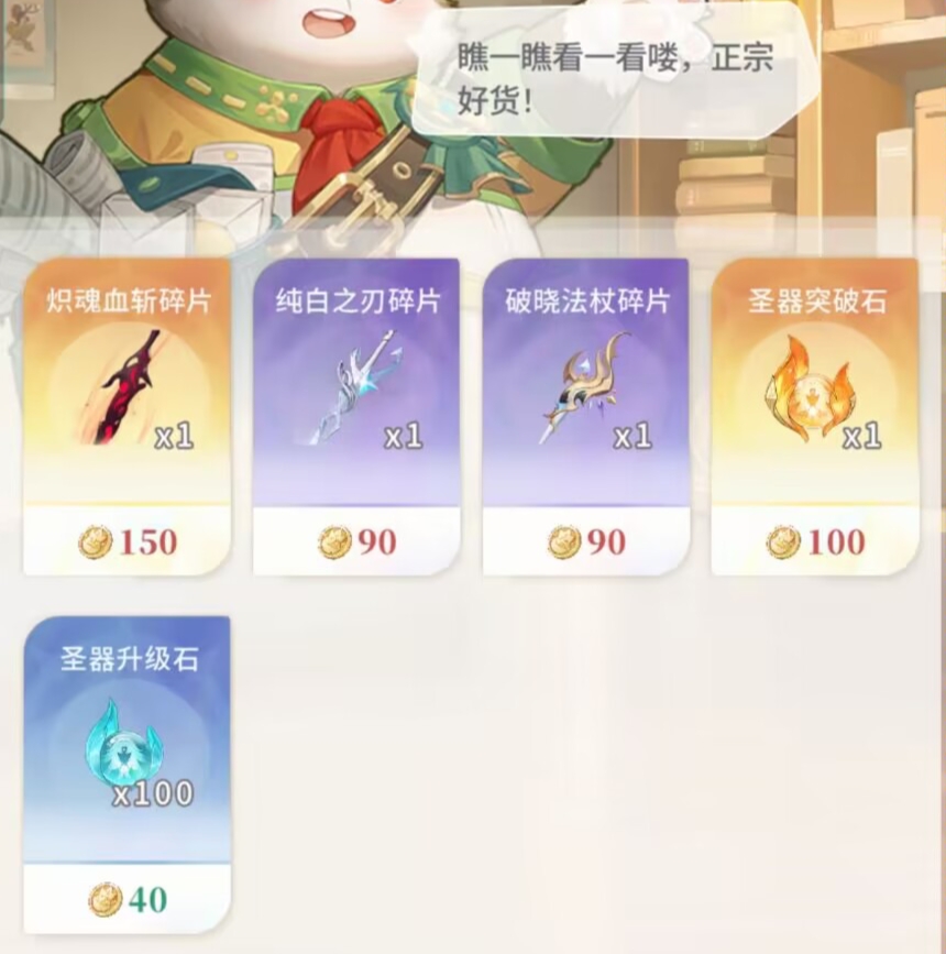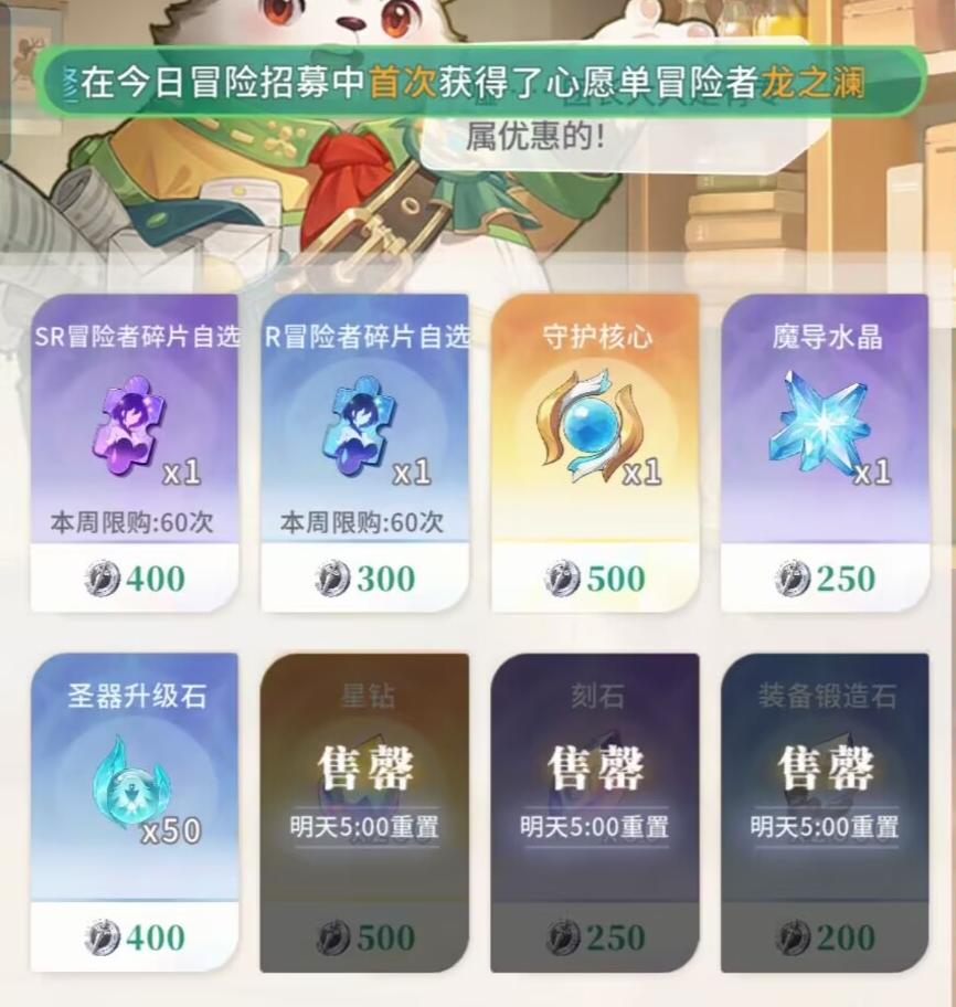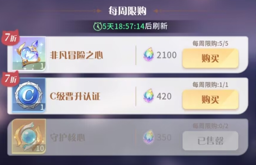 ④其次考虑兑换:SR冒险者碎片、圣器升级石、守护核心。