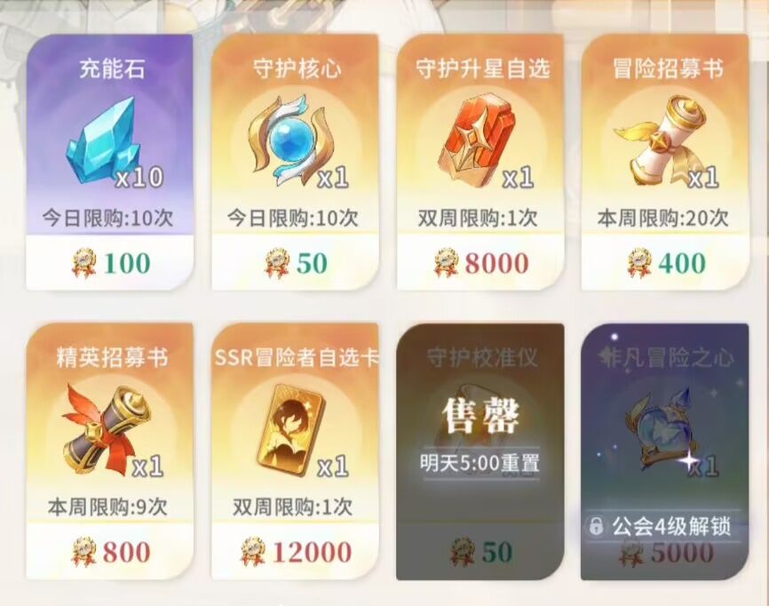 3:【公会商店】4级前–兑换推荐。前期我们的公会勋章也是比较缺的,所以没有特别多的资源去兑换我们想要的物品。