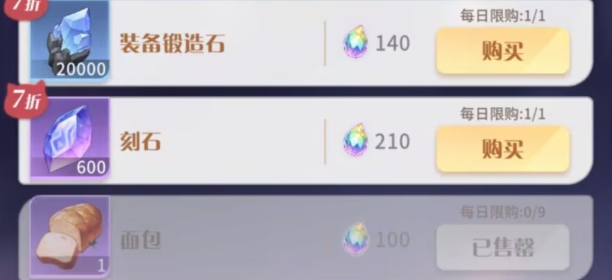 ①优先购买:面包、刻石、装备锻造石。这三个每天可以买满。
