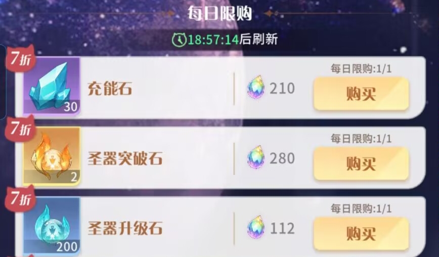 ②其次考虑购买:充能石、圣器突破石、圣器升级石。