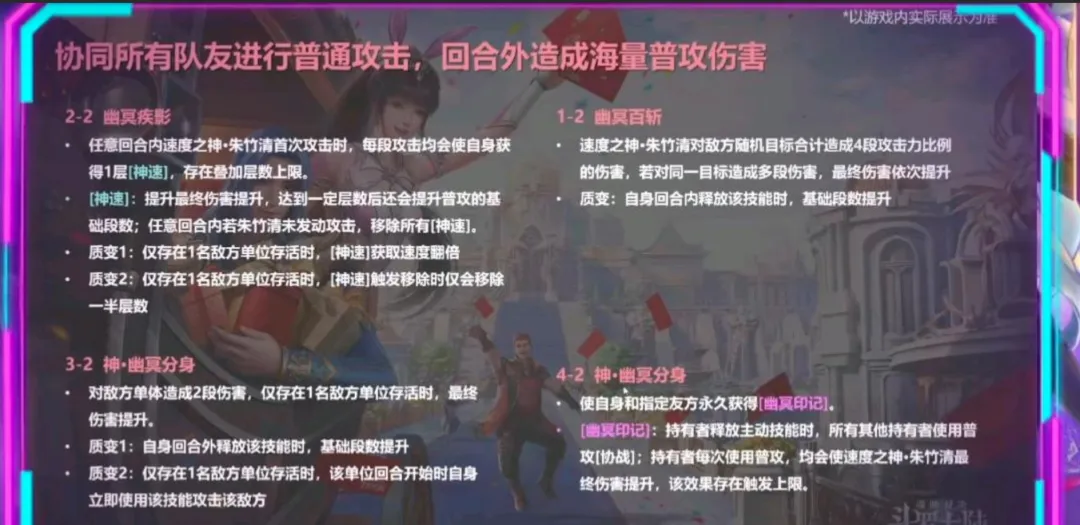 而在昨天的前瞻攻略中,维一也明确说到了SP朱竹清的两套技能机制依然是瞄准于长图主C和PVP副C两个定位来设计的,那其实说白了肯定就是要和SP小舞抢饭吃了,而SP小舞也才刚刚返场没多久的时间,大部分玩家对于这位角色的保有率也不算低,甚至很多朋友都还在养的过程当中,而SP朱竹清就算强势,她也就最多能做到以下这种程度: