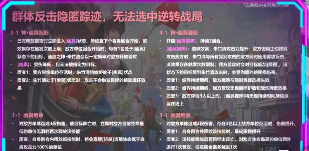 长图单桩的主C,泛用性应该会比SP小舞更好,毕竟SP朱竹清目前看来并不需要开局5个敌人,最后死到1个敌人的战斗环境需求,她只需要敌人剩1个即可发挥出更强的长图实力