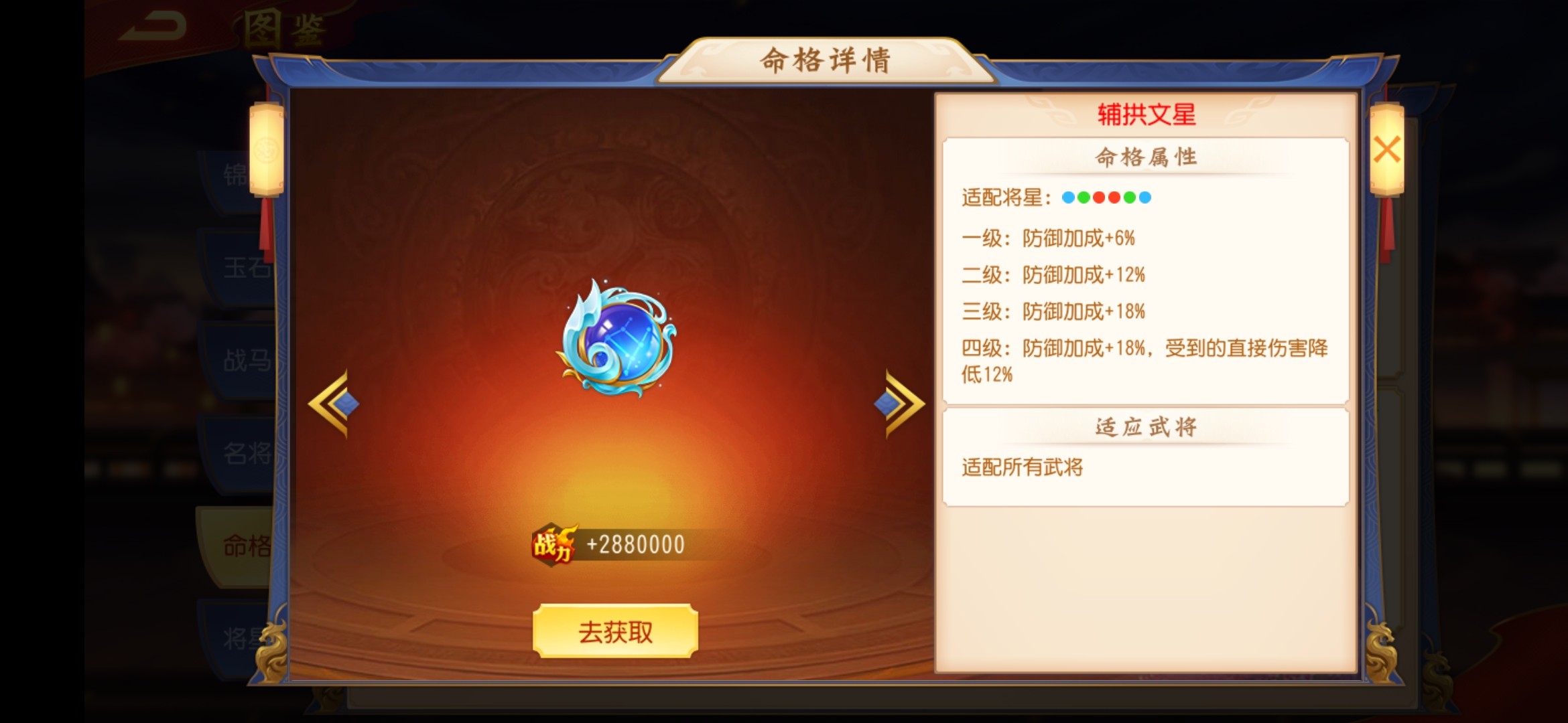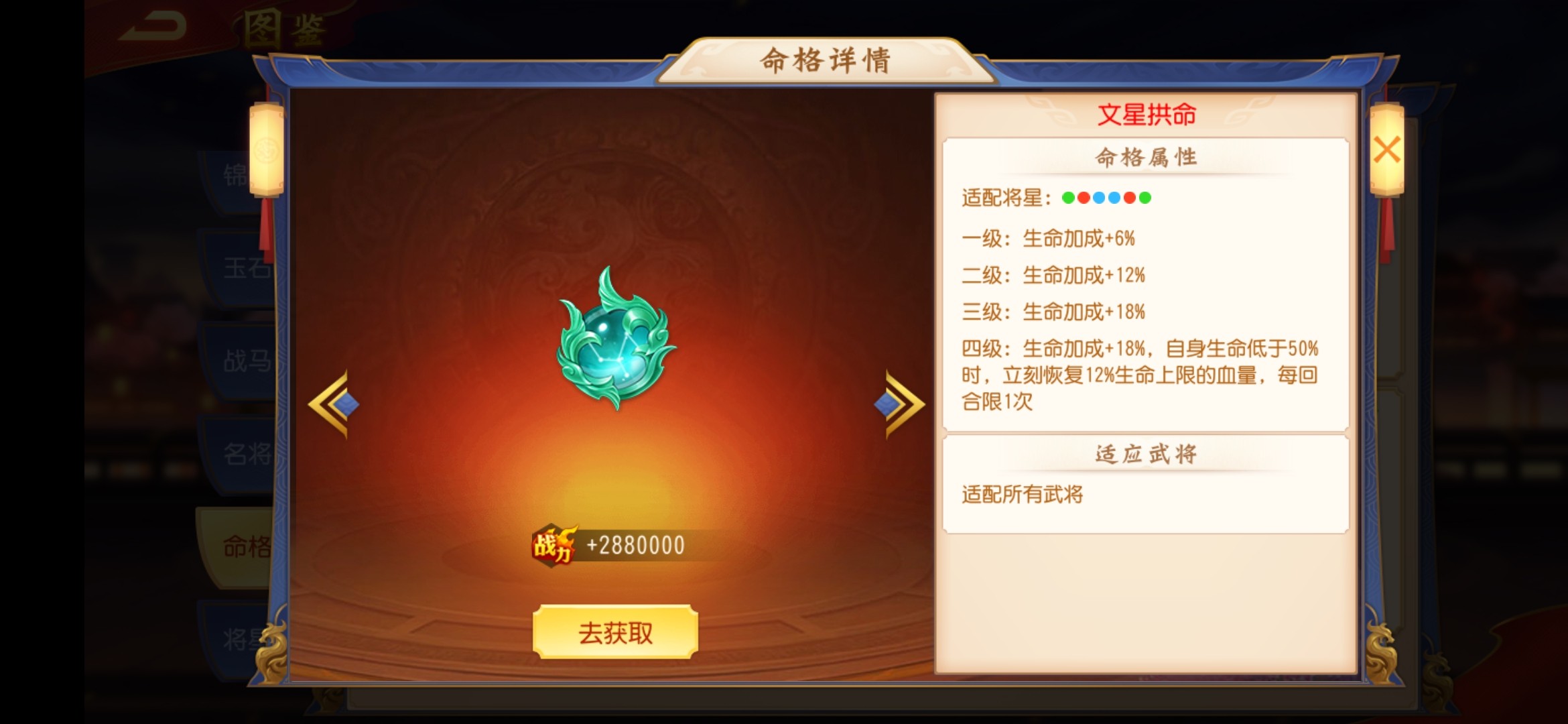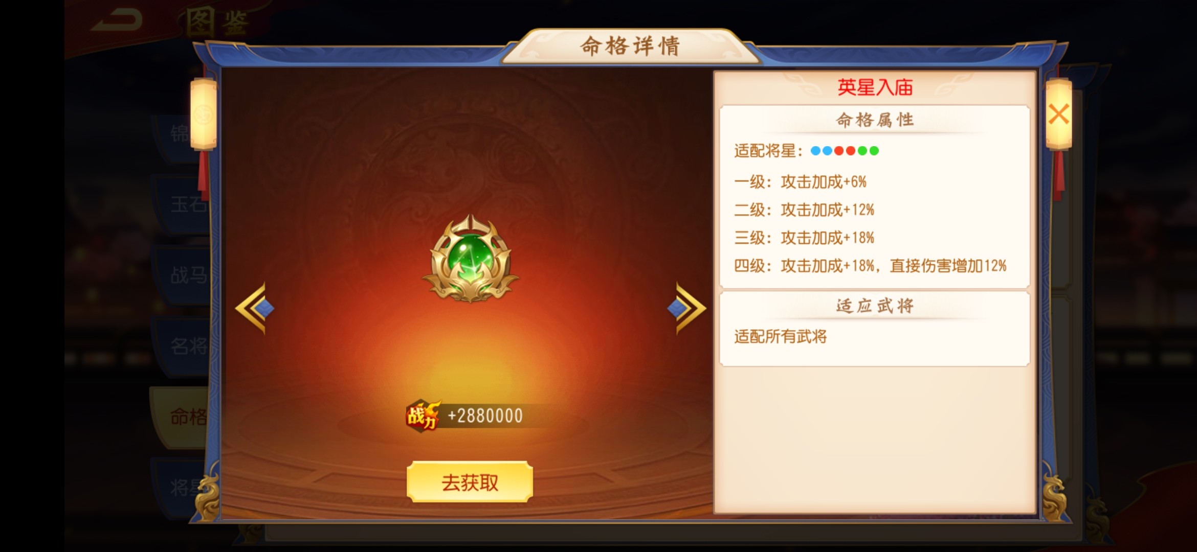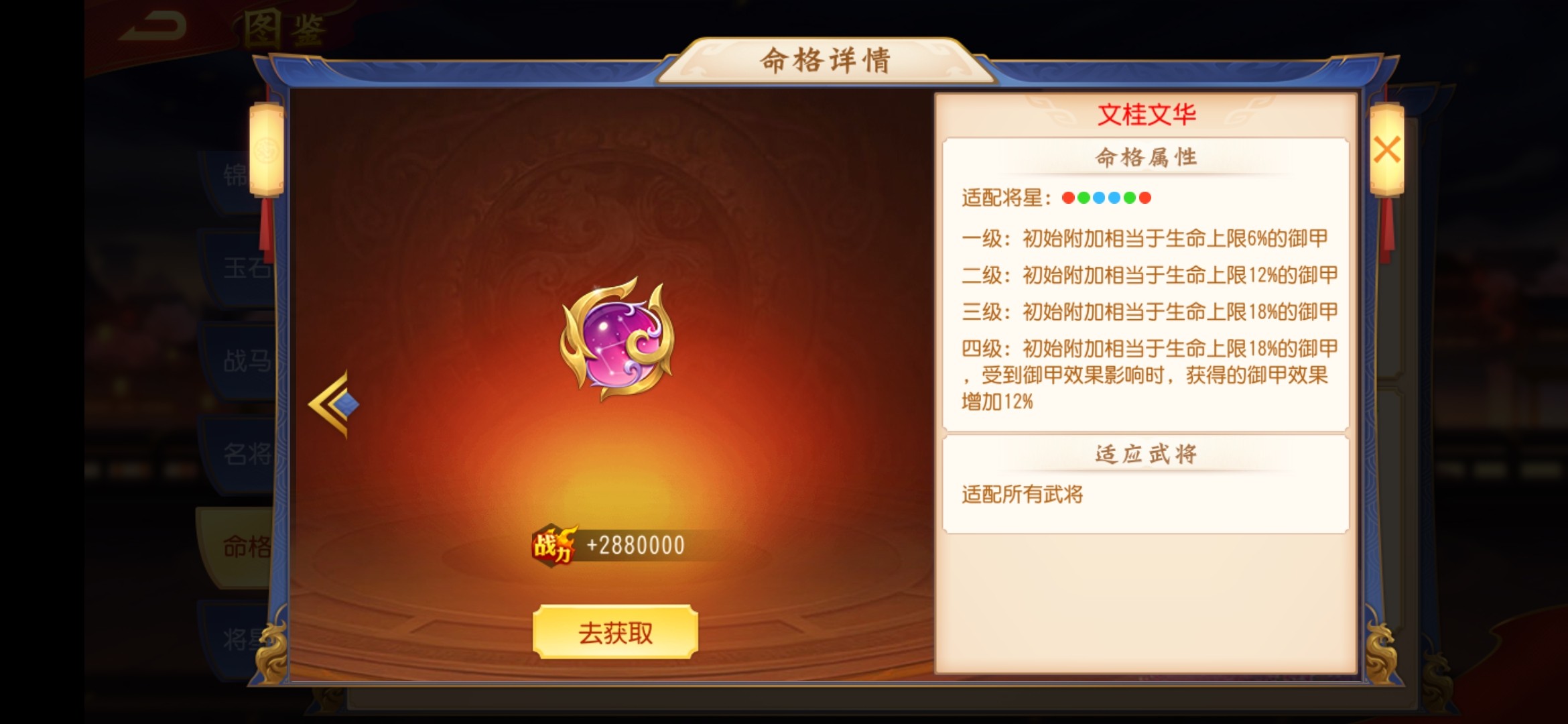 这是一个全新的玩法。目的是进一步提高单个武将各方面的属性。包括攻击伤害。防御能力。减伤。增伤。等。命格的界面会出现在锦囊的右边。