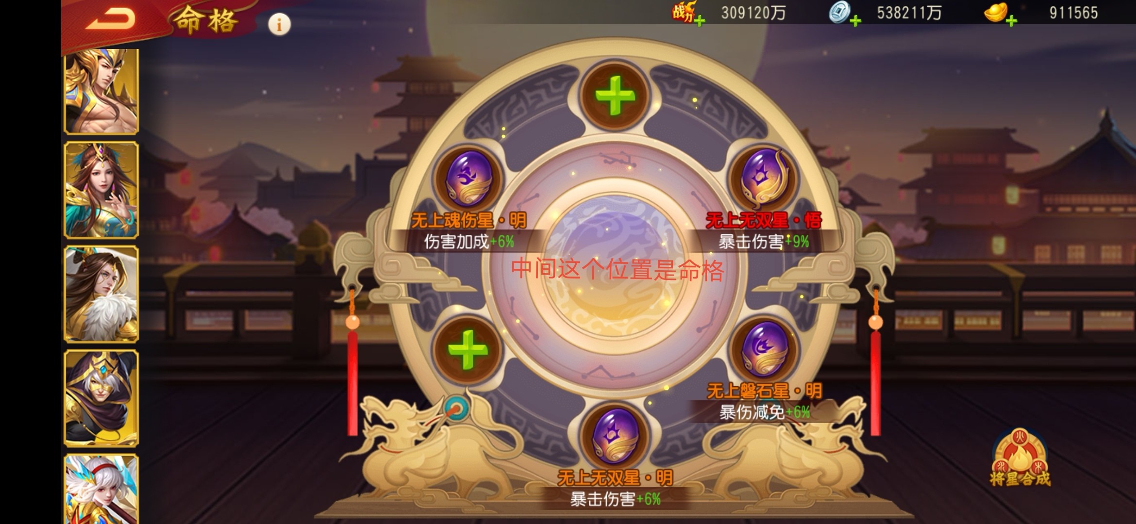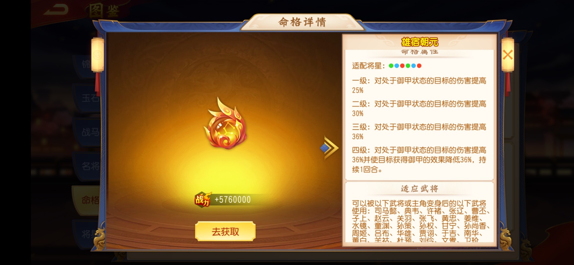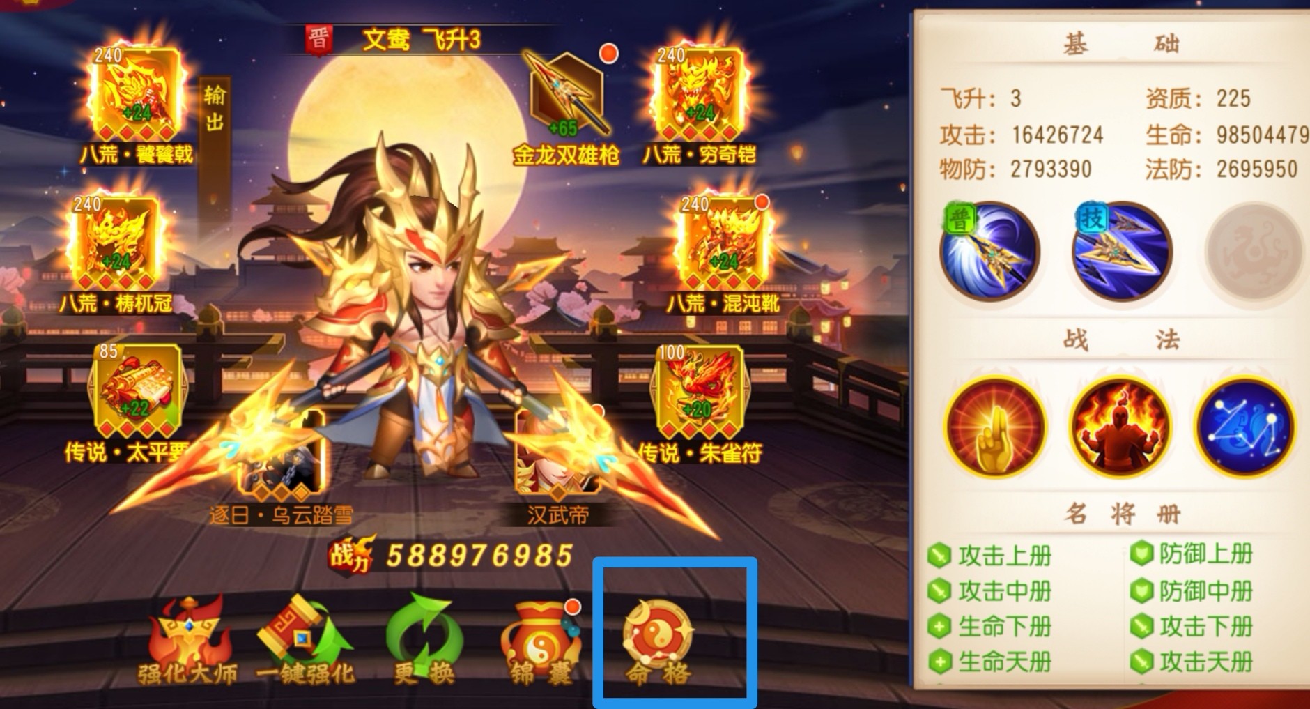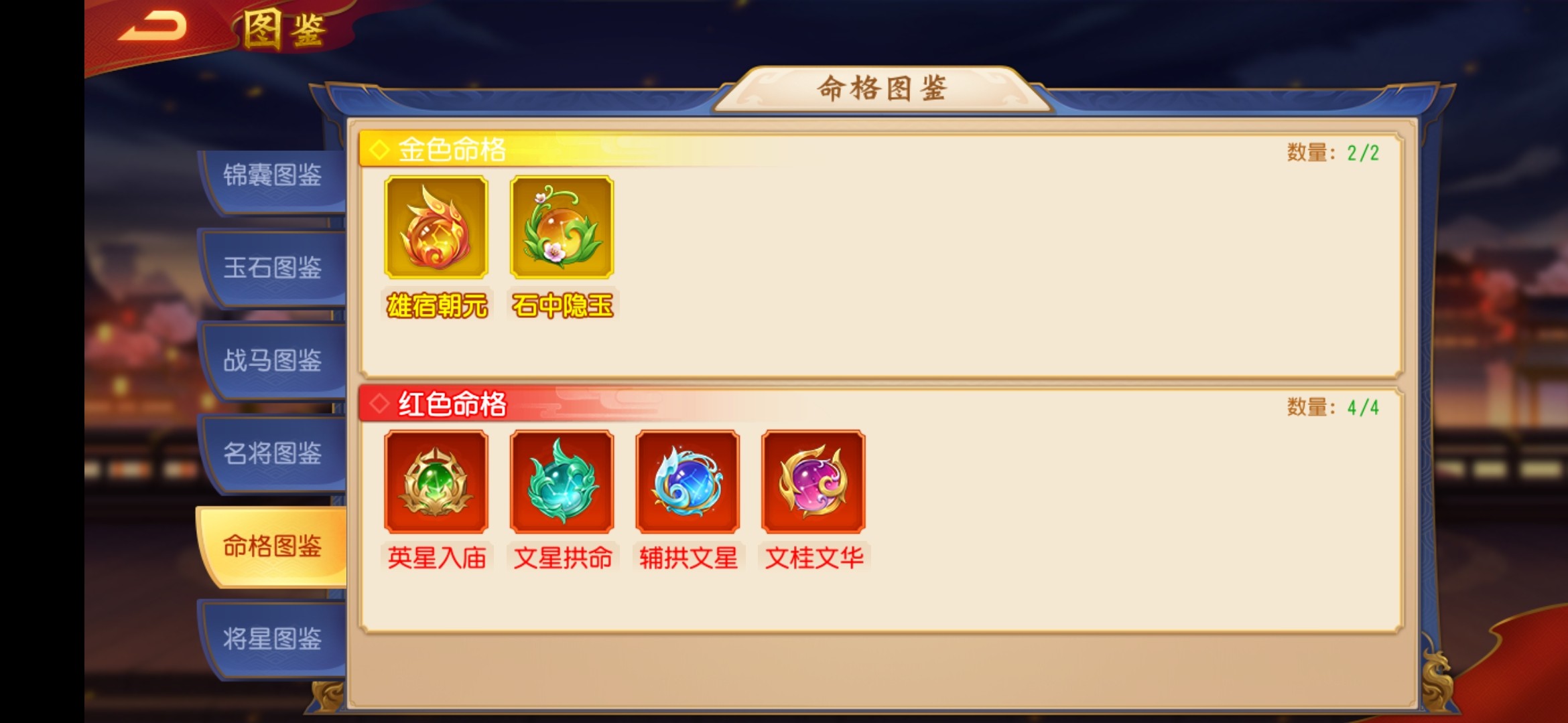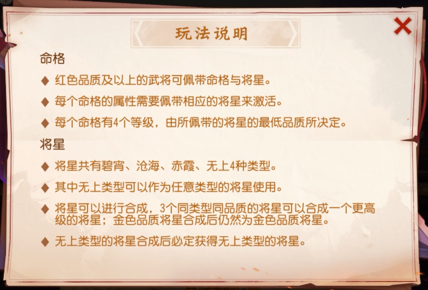 这是一个全新的玩法。目的是进一步提高单个武将各方面的属性。包括攻击伤害。防御能力。减伤。增伤。等。命格的界面会出现在锦囊的右边。