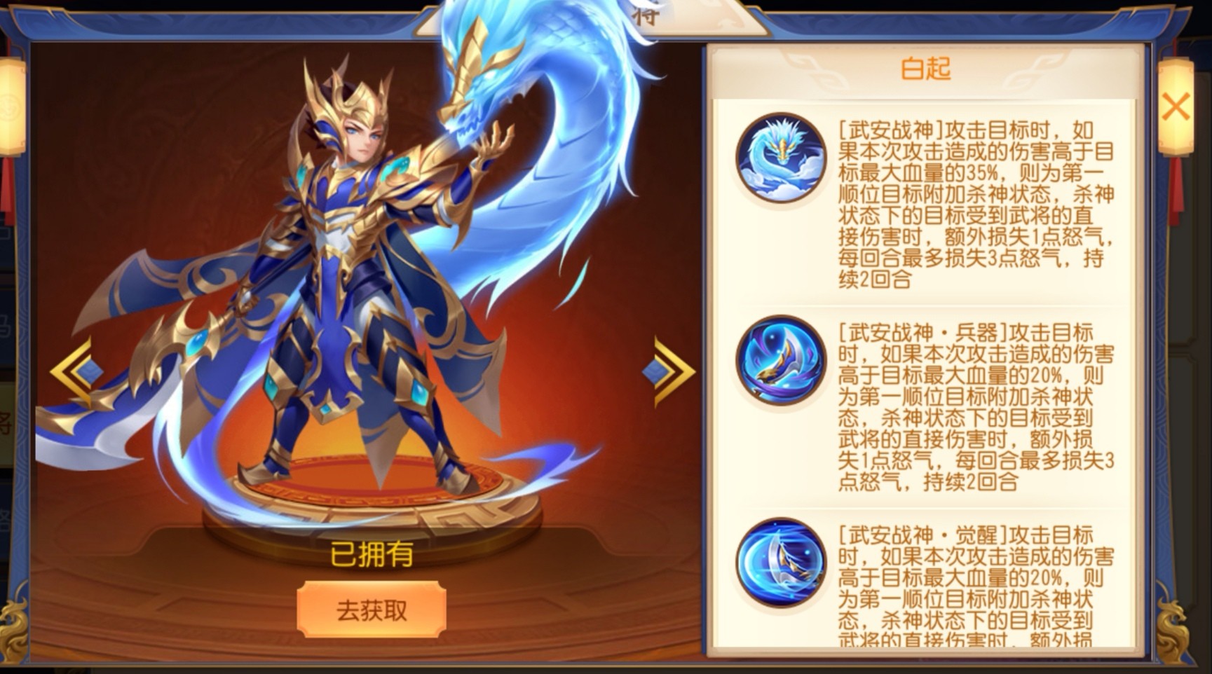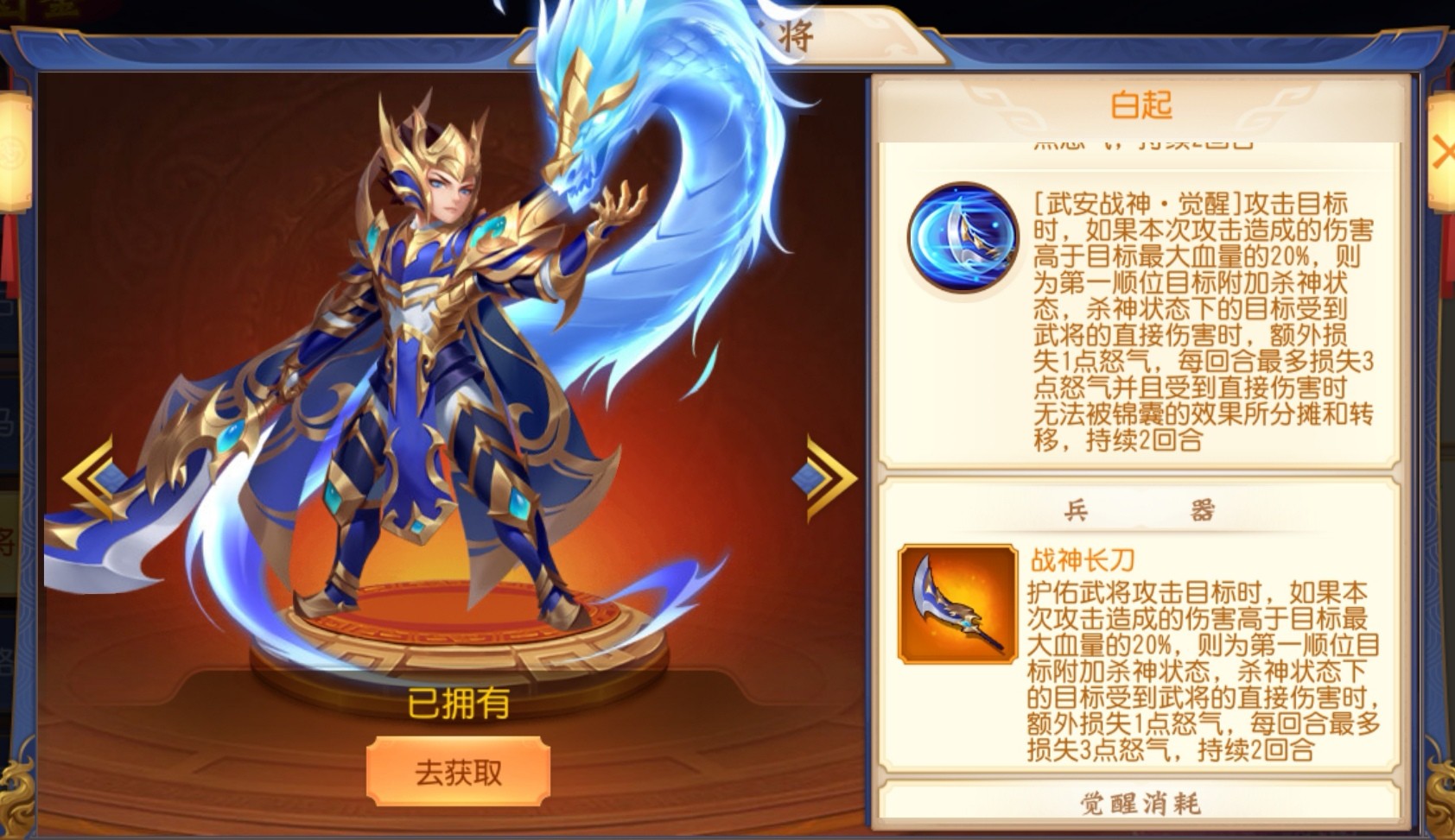 橙名将白起是属于辅助类名将。可以给对手附加杀神状态。从而降低对手武将怒气。咋一看好像作用不大。但是认真看一下还是非常强的。有几点我分析一下。