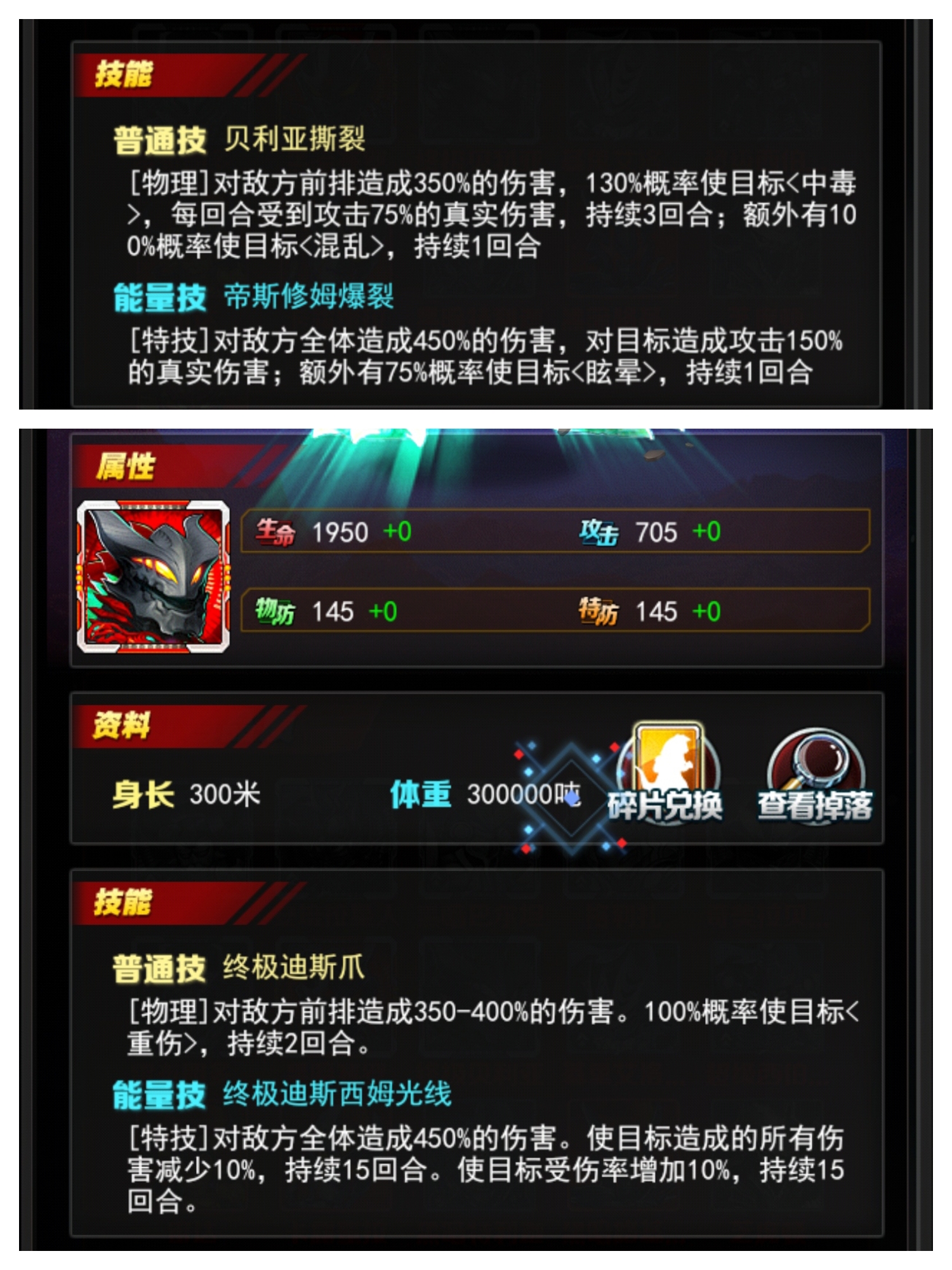 奇美拉的“帝斯修姆爆裂”为特技,对敌方全体造成伤害,而终极迪斯的“终极迪斯西姆光线”同样为特技,但也是对敌方全体造成伤害,两者都具有高伤害输出,但终极贝利亚的技能还附加了减伤和增加受伤率的效果,奇美拉有真伤和眩晕效果持续时间不长,效果不是那么美好