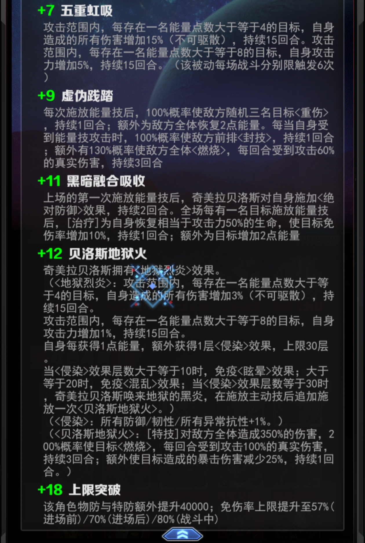 4.每当能量技攻击,130%概率使敌方全体燃烧:60%真实伤害×3回合
