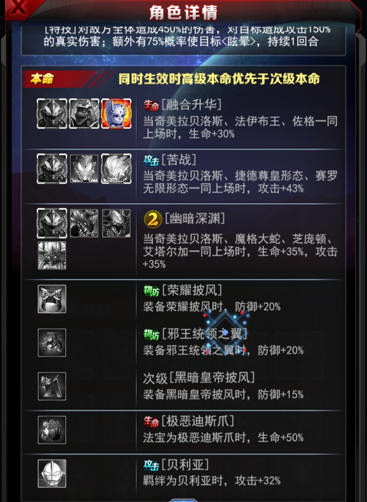 终极贝利亚的技能则附带重伤和状态削弱效果:“终极迪斯爪”100%概率使目标重伤。“终极迪斯西姆光线”使目标造成的所有伤害减少10%,同时使目标受伤率增加10%。