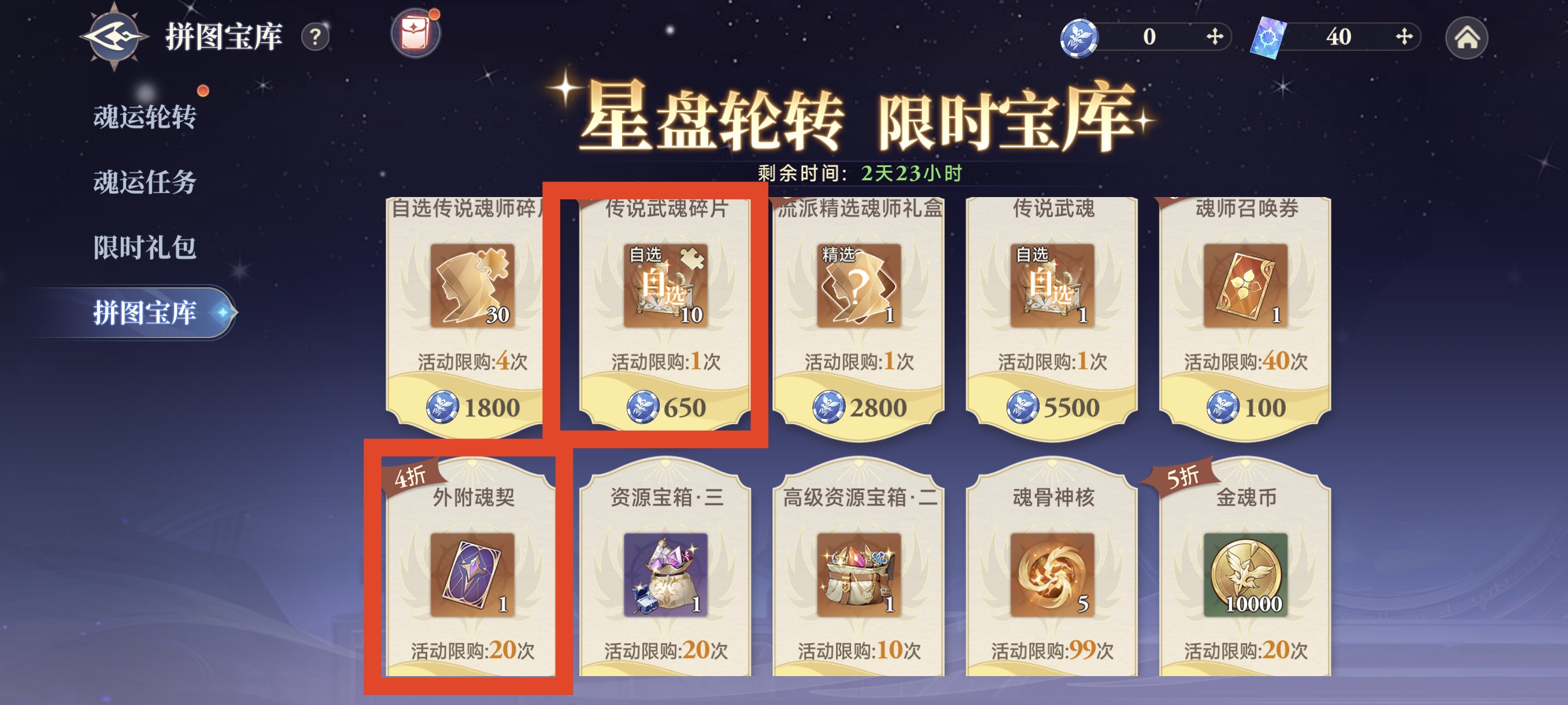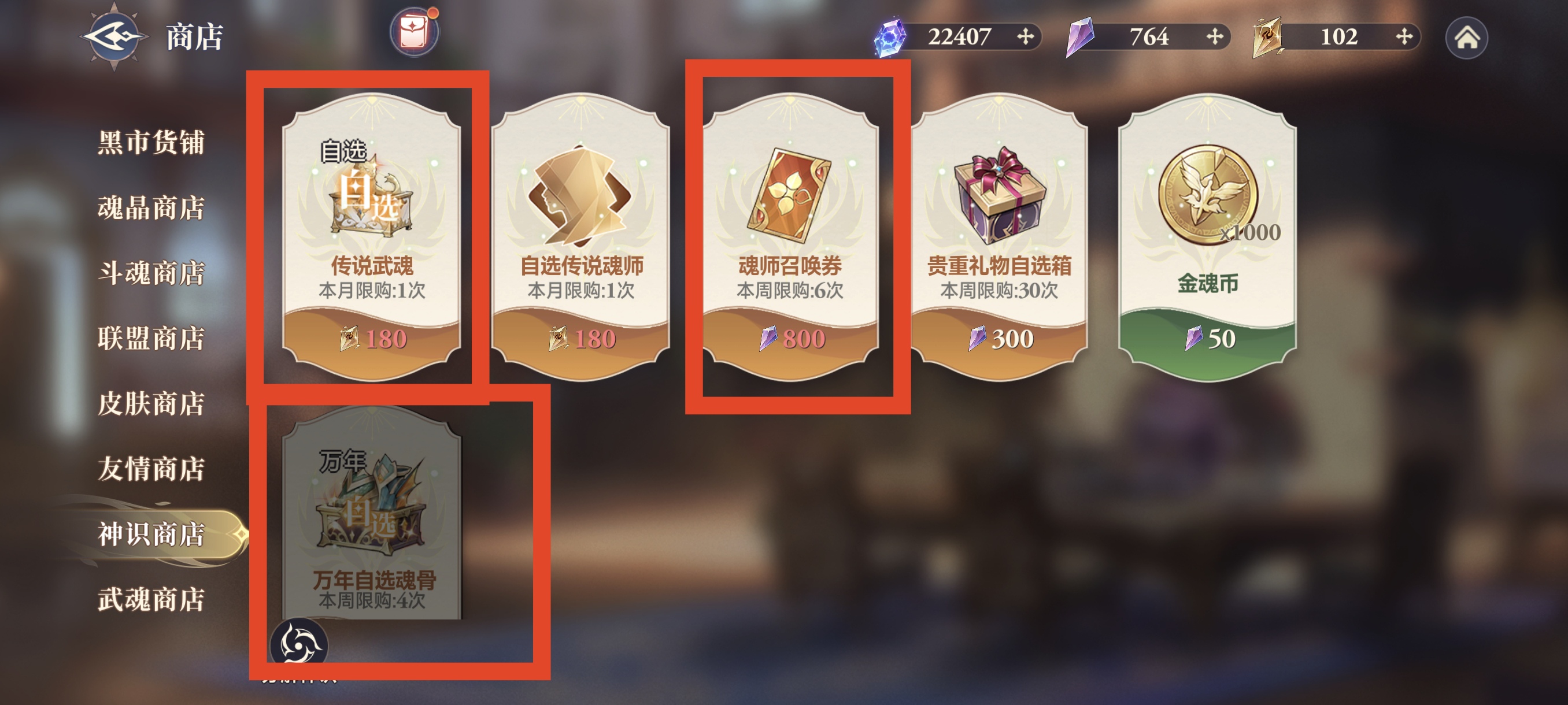 每周的抽卡券必买,后续解锁万年魂骨后每周的魂骨必买。