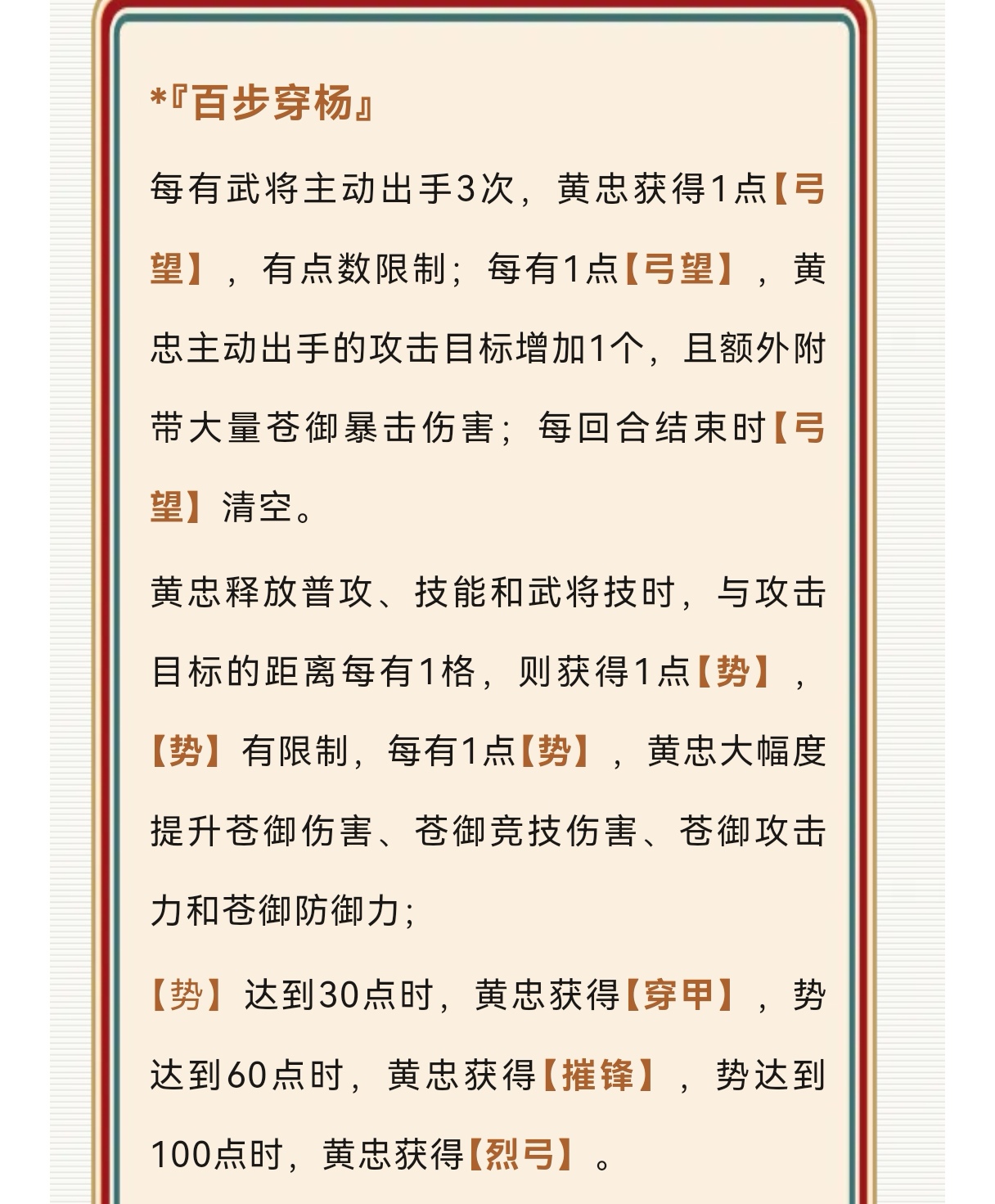 被动是黄忠根据全场武将出手叠加势和弓,弓拥有额外目标和额外暴击,势拥有无视防御、降低敌方生命上限、暴击溅射,一列武将可以获得黄忠的攻击和防御,帮助黄忠抗伤。
