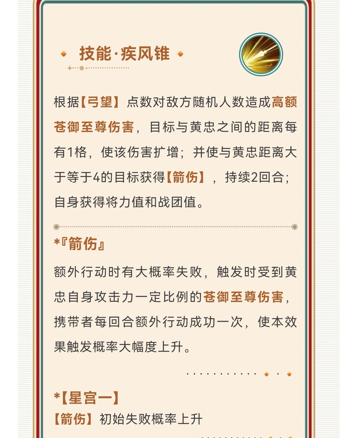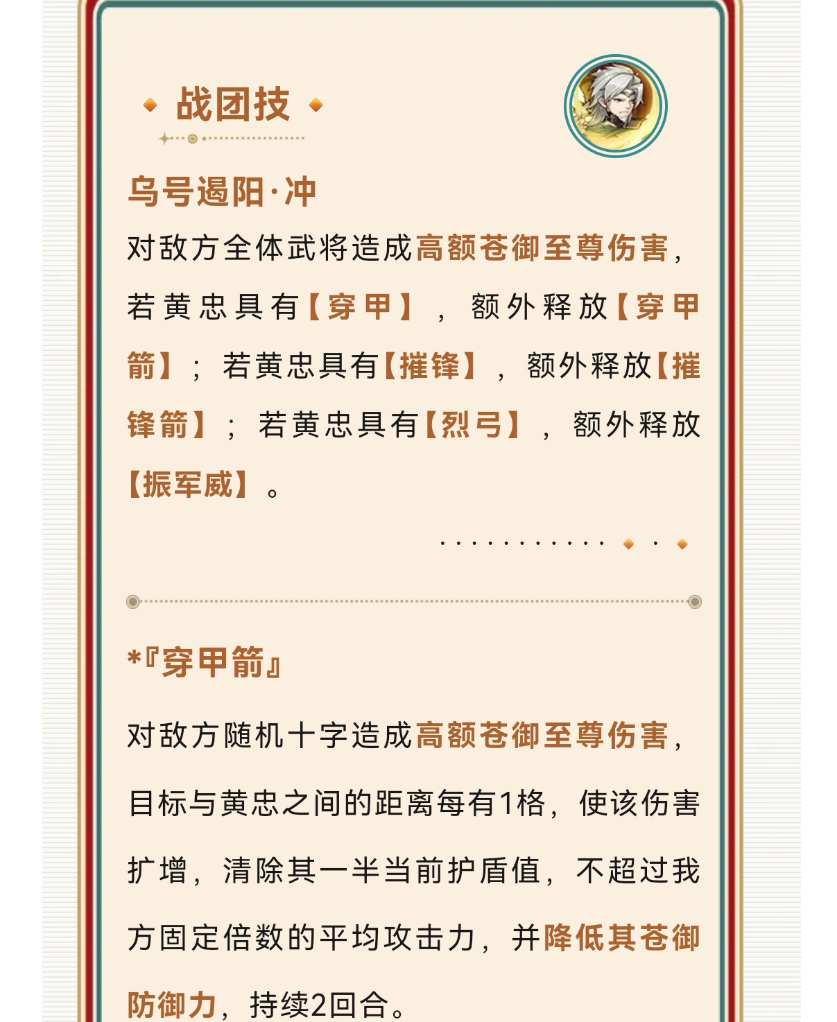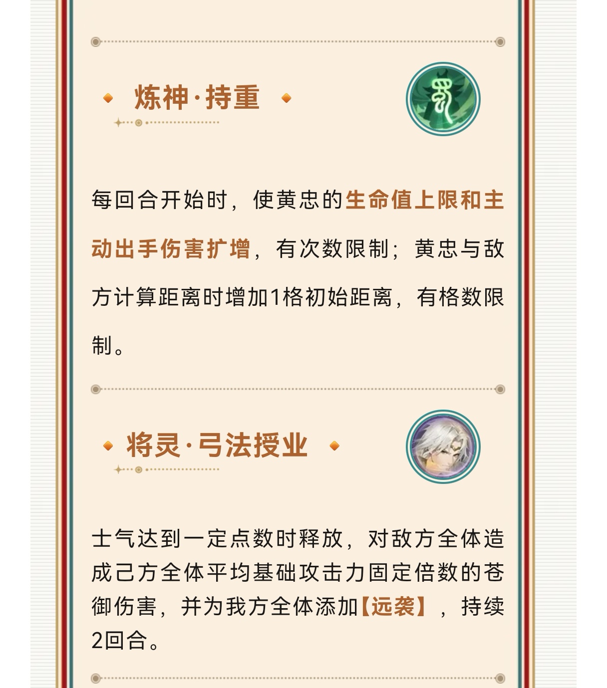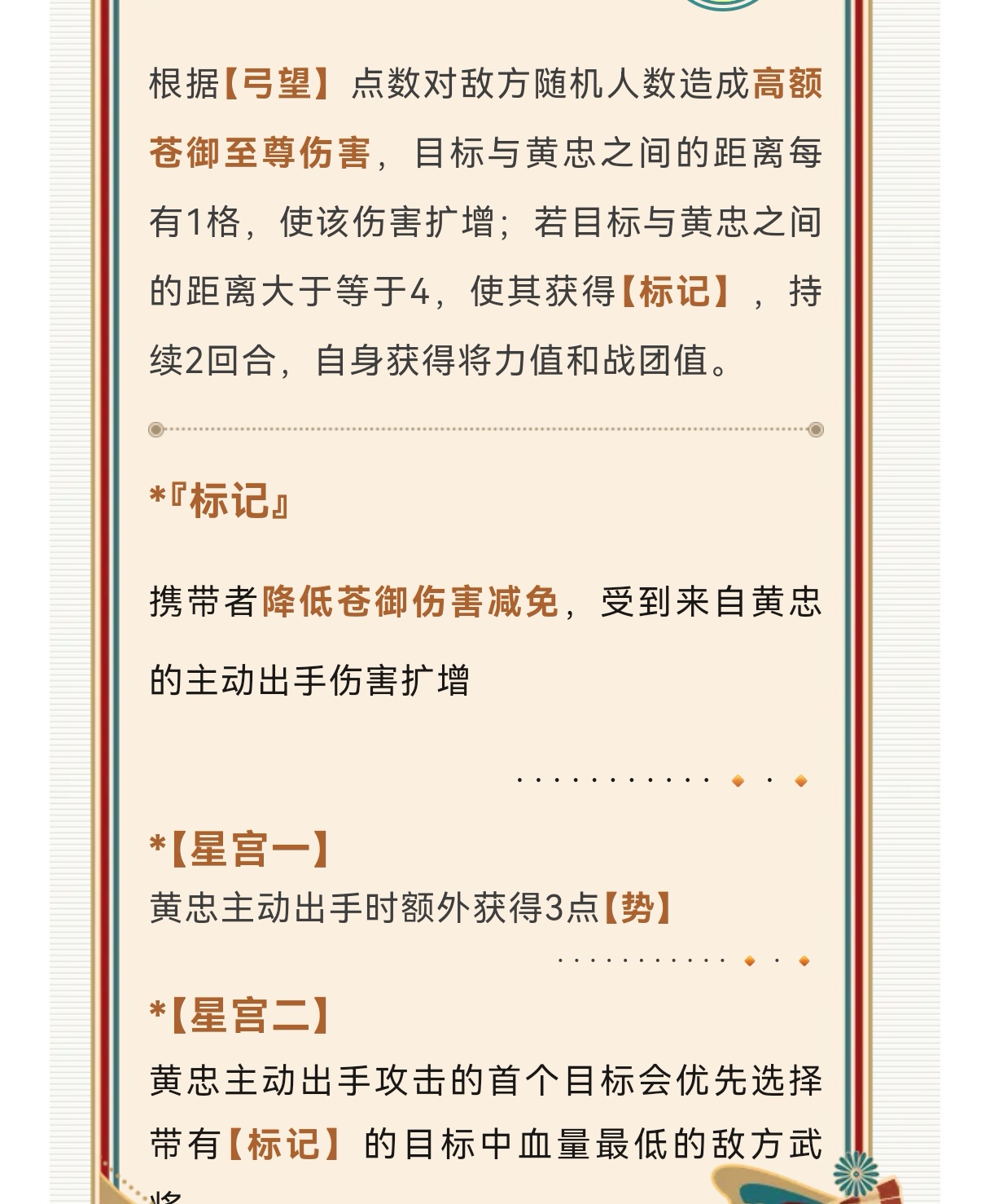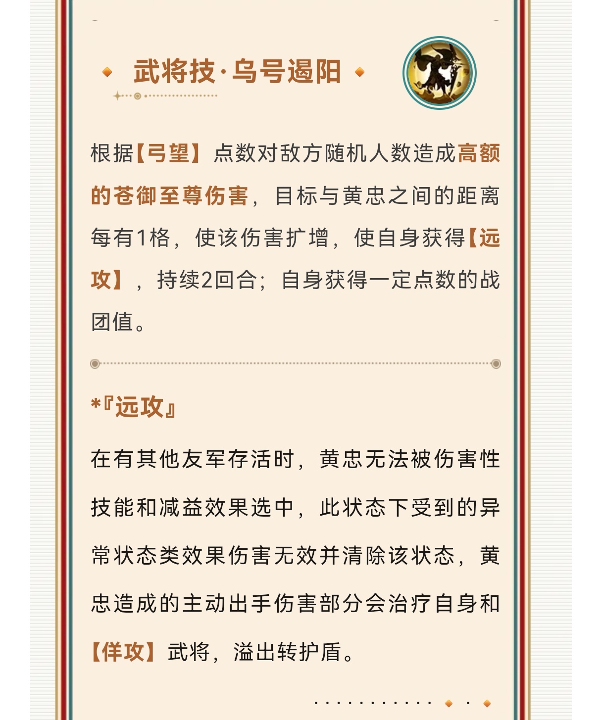 黄忠核心优势就是距离值、弓和势的叠加,弓加额外目标,距离有额外增伤限制,势可以清盾扩增等等的,黄忠距离就是需要放置后排位置,同时配合同列佯攻提高黄忠保命,缺点是黄忠除了远攻保命手段会少些。