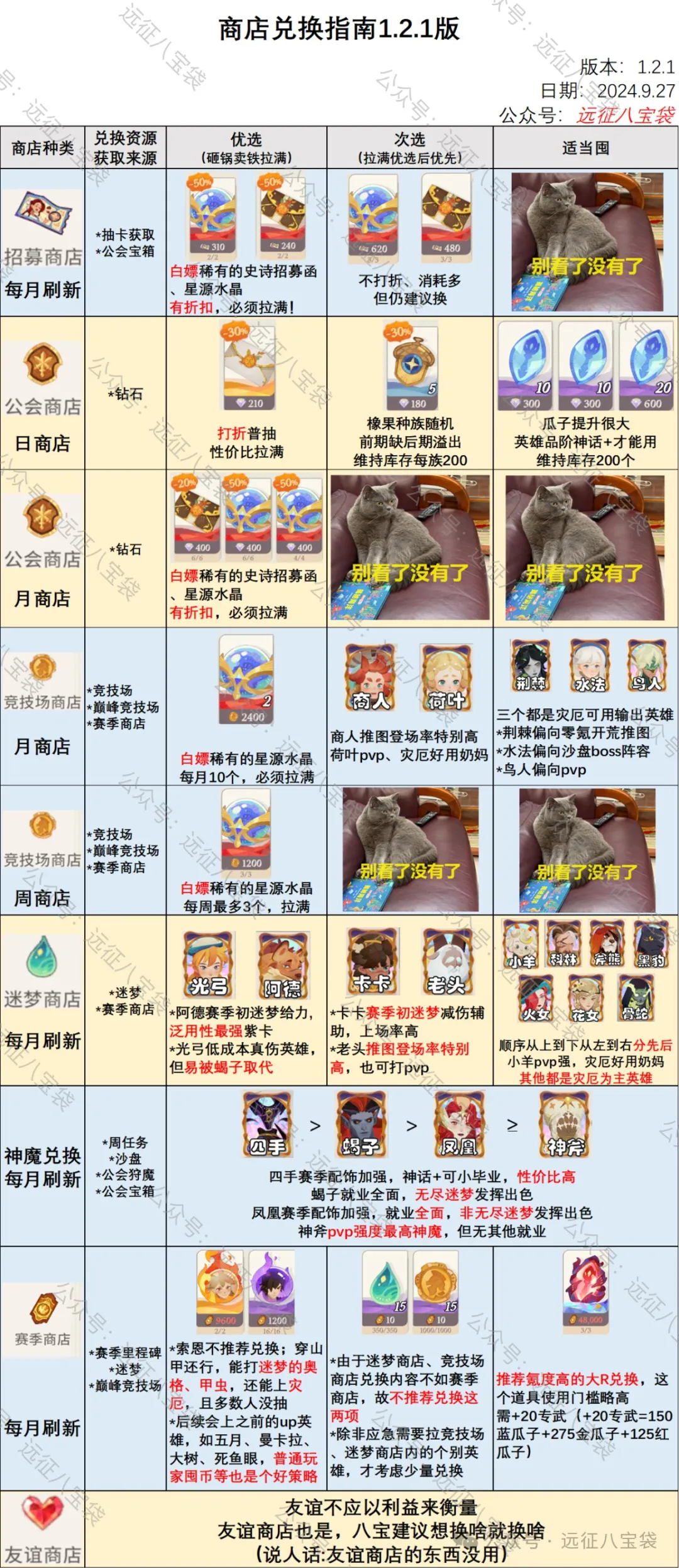 下面说说相较之前版本变化较大的地方 ⭐竞技场商店 竞技场商店,可兑换英雄的强度一般 (除了零氪开荒的荆棘 与推图泛用的商人) 故攻略建议大部队换星源水晶为主 有剩余资源才会考虑兑换英雄 灾厄玩法的出现 令英雄需求变得多样化 输出英雄水法、鸟人、荆棘有上场机会 建议作为考虑兑换的目标 大佬不缺抽卡资源 也不缺红瓜子使用门槛金瓜子 才建议考虑红瓜子 ⭐迷梦商店 五月、蝎子的出现 影响了真伤紫卡英雄的出场率 迷梦商店里的英雄 不再是迷梦玩法的绝对主力 在阿德、光弓、卡卡、老头毕业后 建议兑换巅峰竞技场、灾厄相关英雄 迷梦商店里长时间不增加新的兑换英雄 让迷梦币有贬值倾向 ⭐赛季商店 *英雄兑换 理论上,赛季商店月初刷新 会改变可兑换的英雄种类 按登场顺序上架之前进过up招募的英雄 比如热门的大树、五月、曼卡拉 这三个英雄强度在线、就业多样 普通玩家没拉满的话,建议囤币等等 注意单英雄兑换最多消耗19200赛季币 理论上,一个英雄也只会上架一次 囤也别囤过量了 不考虑其他赛季币获取来源 仅计算稳定每日结算的玩法 巅峰竞技场、迷梦(战区) 按稳定排名101-200 每月囤(380*21+170*30)=13080币 仅供参考 *迷梦币、竞技币兑换 迷梦商店换紫卡花1200币 赛季商店换紫卡花1200币 竞技商店换金卡花9600币 赛季商店换金卡花9600币 兑换消耗的货币数量一样 但赛季币换兑换竞技币/迷梦币 兑换比例是1:1.5,咋一看很划算? 然而八宝觉得不划算! 竞技场商店、迷梦商店里的都是旧英雄 赛季商店可兑换新英雄 而新英雄比旧英雄强,这是必然的 按目前赛季币的囤积速度看 如果要多换新英雄,应该不会有余量 除非应急 否则不建议赛季币换竞技币/迷梦币 *冥日凝晶 氪度越高的玩家越不缺抽卡资源 新英雄的获取不是问题 赛季币建议就换冥日凝晶![]()
