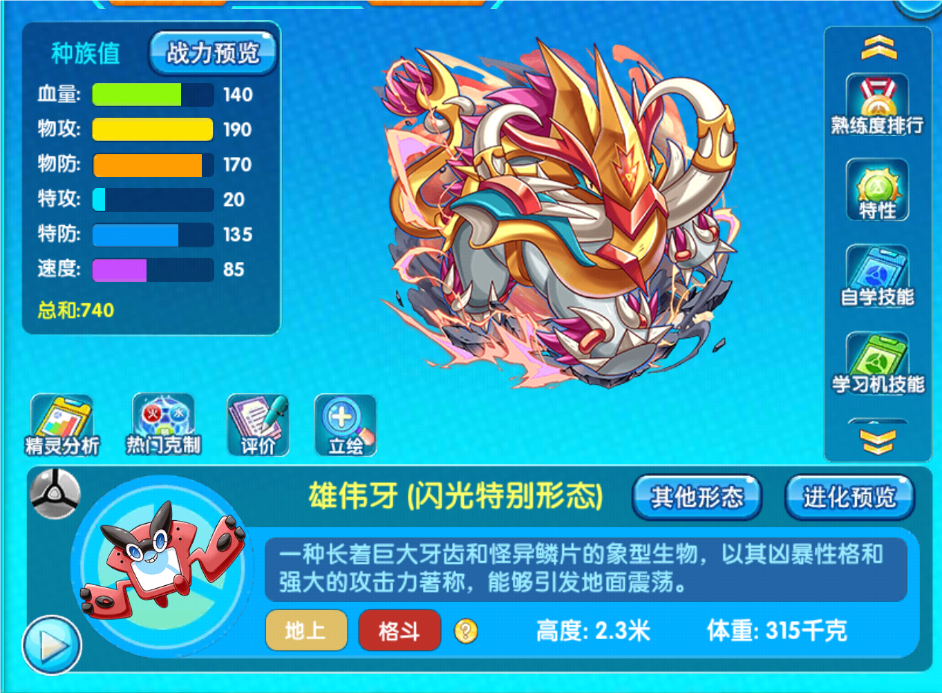 至于性格和努力的话,正常来说肯定是极限物防好一点,但是这个精灵的输出能力其实也不低,如果可以的话,可以考虑物攻极限输出技能可以不用变化或者是再加上攻击招式,专门抓对方的钉子,宠物上场或者是等对方出钉子宠物的时候,第一时间上场消耗地动状态强化自身能力,这些都是可以的,所以说这个精灵可玩性可以说是非常不错,同时也是游戏里面很少见的格斗加地上属性的配置。