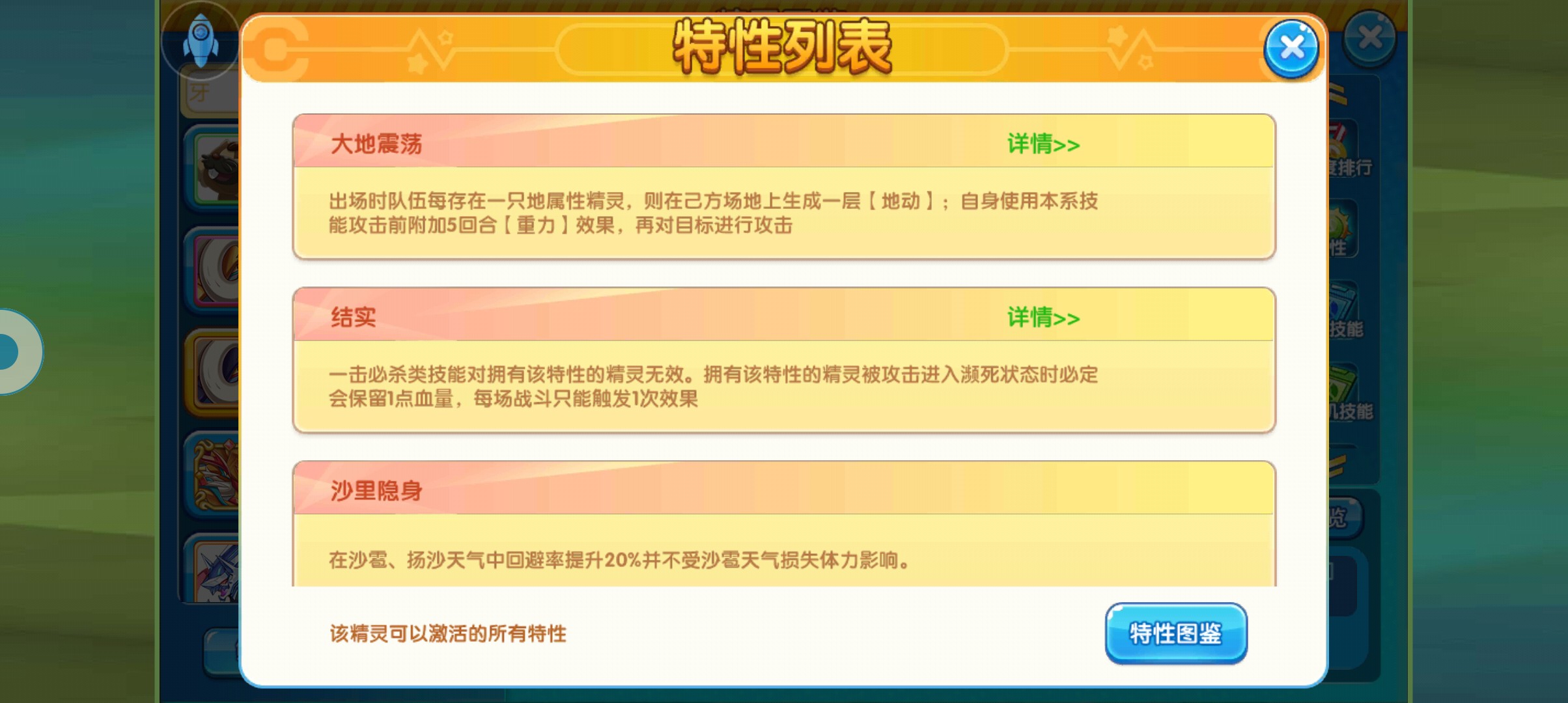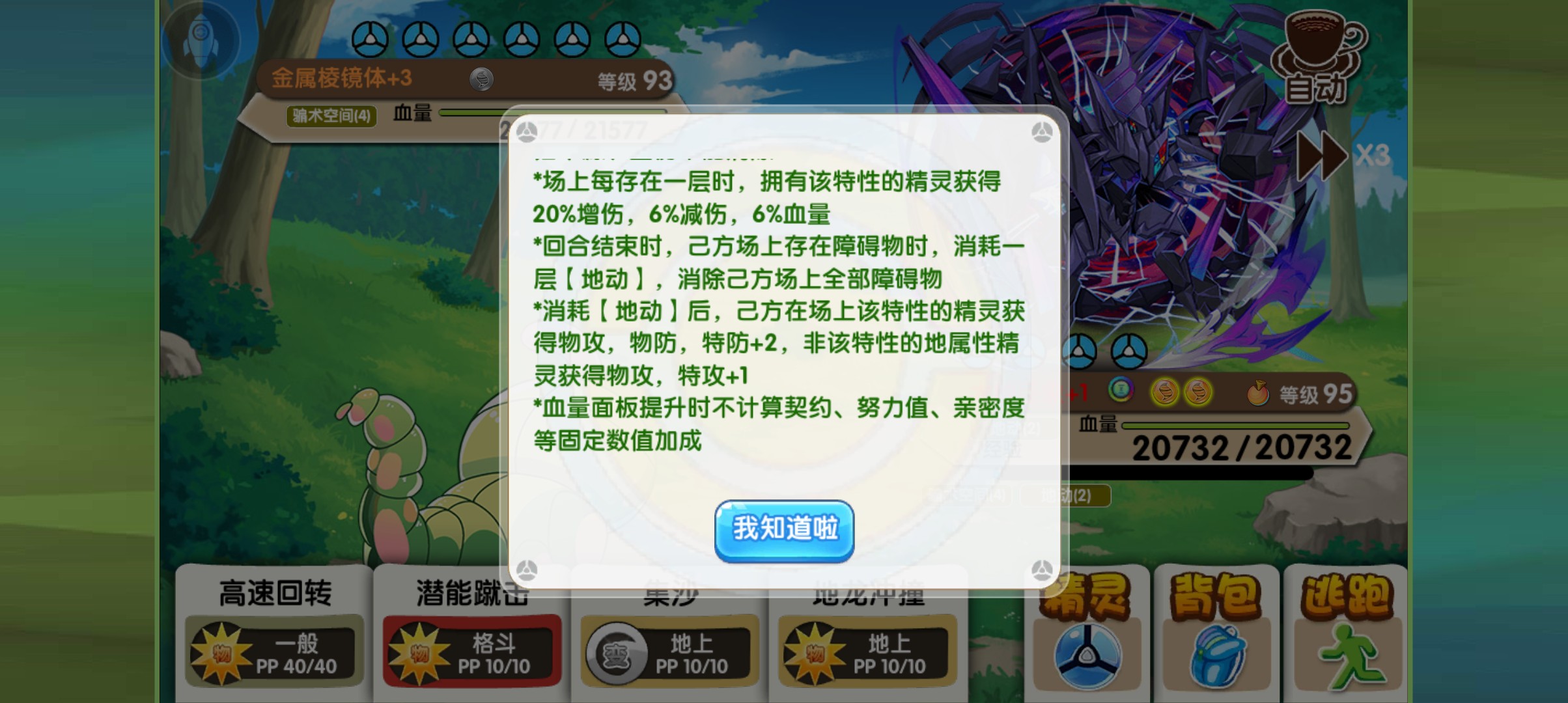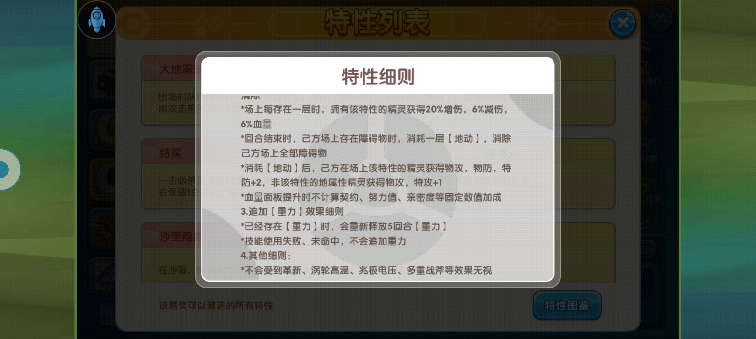 前面我也说了,面对飞行属性的时候,的确会处于劣势,但是可以利用特性来弥补这一个缺点那就是使用本系攻击招式攻击前会先释放五回合的重力状态,然后再进行攻击重力状态可以让地上属性招式攻击飞行属性,所以有了重力状态,不仅可以让自身打到飞行属性,还可以做出更骚的操作,比如说你自己可以下钉子,然后让对方的飞行属性宠物受到满地星和毒尖钉的影响。