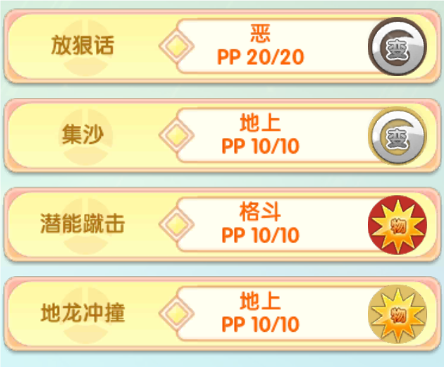 首先,这套技能组合能输出也能辅助放狠话,用来做中转站,能够降低对方的伤害,同时也能够让自身逃脱上自身的队友,地上属性装饰的话,可以考虑地龙冲撞,也可以考虑狂暴沙尘,这个都要看自己的喜欢了,如果想要进一步提高防御能力的话,可以考虑用保护冲撞,至于格斗属性技能的话,是比较推荐潜能蹴击败首先,这个技能效果是可以封锁对方回血状态,再面对一些回血宠物的时候会有奇效,最后一个技能就是专门给自身回血的,因为自己的特性确实能够提升能力,能够解除钉子,能够提升血量,但最大的缺点就是没有回血效果,只能够利用技能来进行弥补,我这套搭配也只不过是一个建议罢了,其实这个精灵还可以学习更好的技能,比如说落拳,如果使用这个技能的话,可以考虑把放狠话换掉,或者是利用幸运饺子回血,然后把这个回血技能换掉,这样的话,自身的功能性就会更多了,如果想要自身肉到爆炸的话,可以考虑锁链,就是每一回合第一次登场都会减伤,能够保证自身的抗伤能力更好。