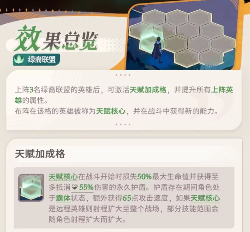 一:【阵容天赋】玩法解读。①【阵容天赋】一共五大阵营天赋,分别对应了:绿裔、耀光、蛮血、亡灵、半神和恶魔。
