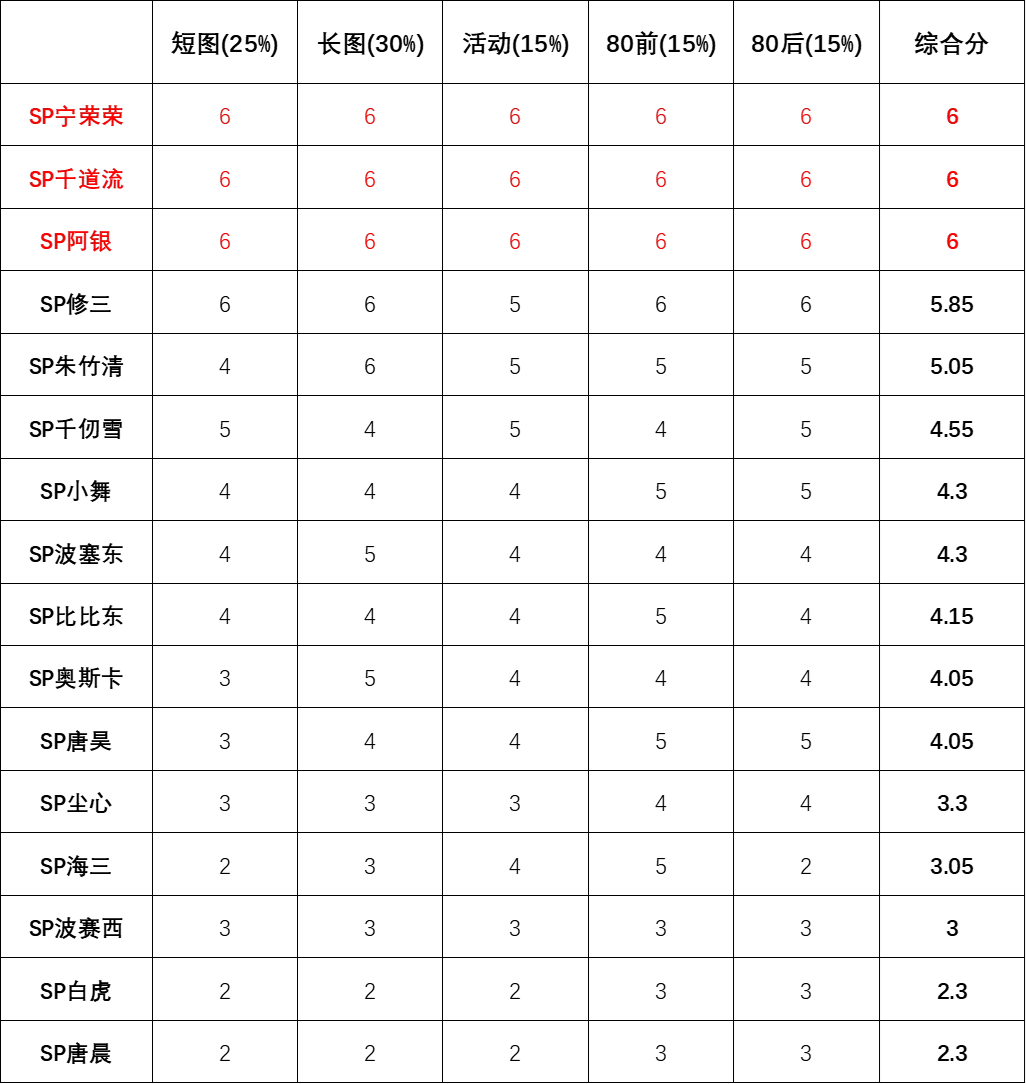 那么如果按照上述的评星,2星算2分、3星算3分......5星+算6分的话,这12位SP魂师的排名如下(鉴于玩PVP的玩家还是少数,所以短图权重为25%,长图权重为30%,活动权重为15%,PVP权重为30%):