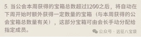 上周公会获取的宝箱数量超过1200 本周会额外获得一定数量的宝箱 但这部分宝箱只能由会长手动分配 不进入按规则分配的公会宝箱池子 02 公会箱子分配 接下来说说怎么切蛋糕! 如何卷同公会的小伙伴 分配规则由会长选择 “平均分配”、“按活跃度比例” 两个分配规则二选一 选定/修改规则 系统会发邮件通知全公会 前面说了,为了鼓励小伙伴多打箱子 一般公会都会选择“按活跃度比例分配” 即按自己活跃度 占全公会活跃度总和的比例 分配进入公会宝箱池子里的箱子![]()