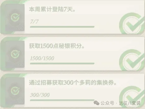 竞技场、迷梦、战斗场次、登录天数 这几样都比较容易完成 另外几个容易被忽略,这里展开说说 *代理作战 需要帮助他人 如借英雄、帮忙布阵、打魔化都算 这个比较容易被忽略,但要完成不难 *秘银积分 这个需要氪金,建议不用强求 *集换券 这个是抽卡的副产品 每周要收集300张 普抽、up招募都是50张/10连 史诗招募100张/10连 星源占卜150张/10连 做好抽卡规划安排,特别是零氪 如果这周的集换券周任务已经做完了 临近周末,可以不抽卡 放在下周一抽,蹭下周的集换券周任务 总之,除了秘银积分外 其他都建议争取做完 03 公会宝箱奖励 ⭐奖励内容 这块特别玄学,主要奖励包括11种![]()