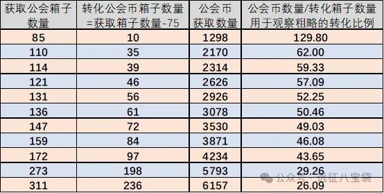 从表中的数据可以看出一些规律 *10个箱子的数据的转化比例异常高 这是由于前面开了75个随机箱子 也会开到公会币 导致这个粗暴计算转化比例的方法失效 *公会币转化比例会随着数量递减 应该是lls为了防止贫富差距过大 这个设计倒是有点用心 *大佬跟我的差距有多大? 以表中147箱子对比85箱子的数据为例 一周箱子相差约2232公会币 一个月算四周,差8928币 3万币一只神魔,这里约0.3只 抽乘以占卜保底40次,等于12次 相当于147箱子与85箱子 一个月差约12个星源水晶![]()