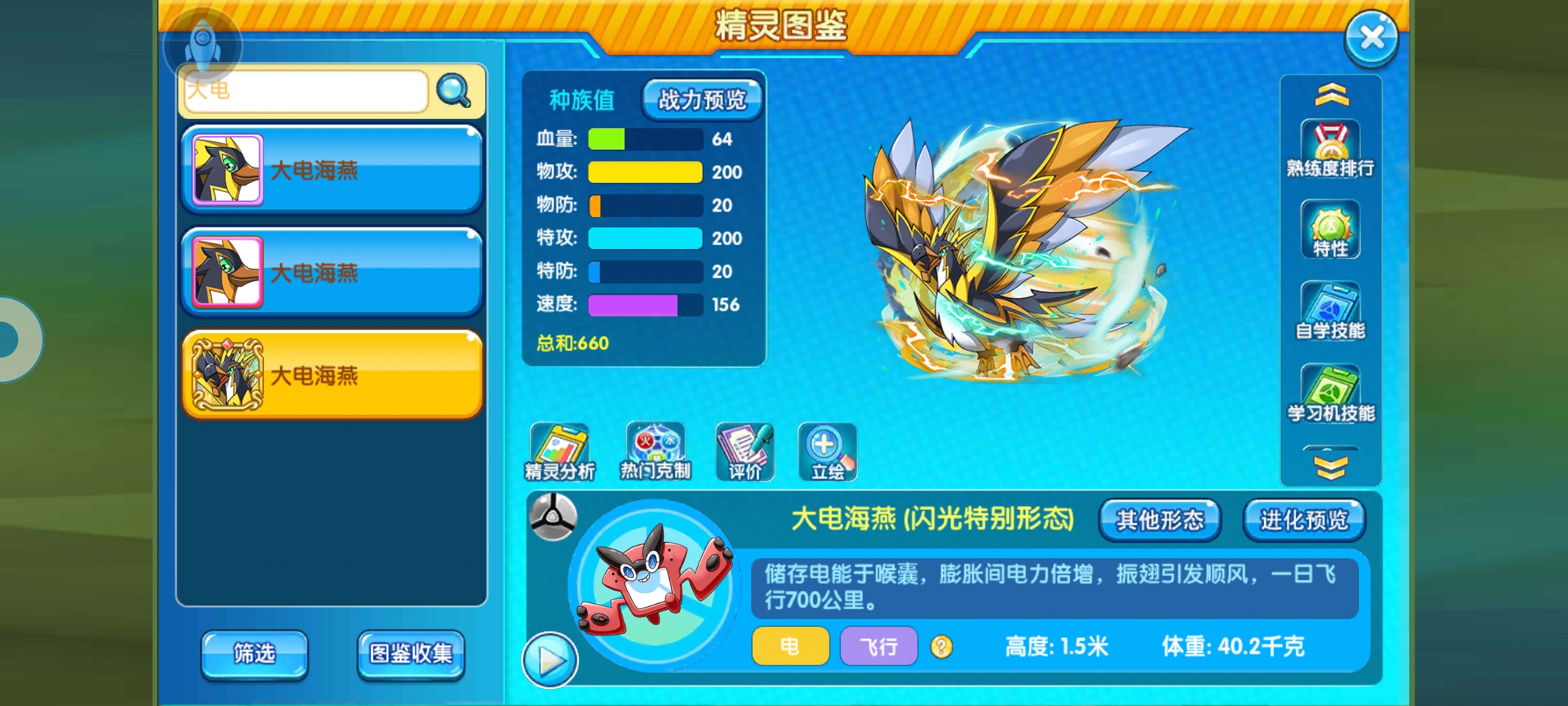 大电海燕有着非常强大的进攻能力和辅助能力,它能够学会的招式也非常多,自身的输出水平也很高,获取也很简单,如果有喜欢的玩家不妨练一只,真的非常给力哦!