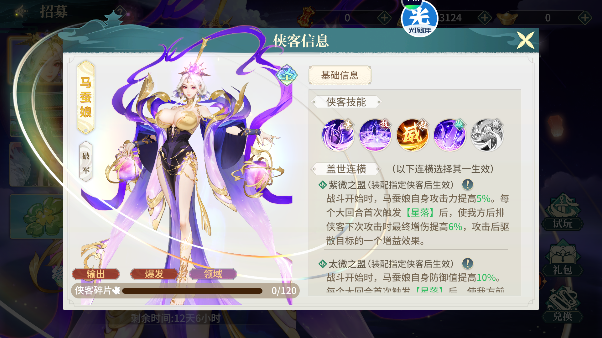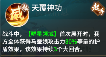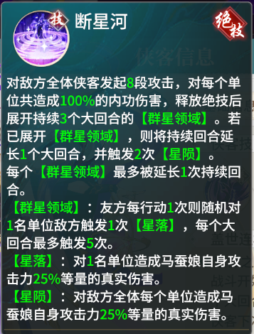 绝1:战斗开始时,展开持续3个大回合的【群星领域】,若已展开【群星领域】,则释放绝技后立刻使友方攻击力最高的侠客释放一次无消耗的绝技,但该绝技造成的伤害/治疗效果只有原本的40%,每2个大回合可触发1次。【群星领域】持续期间,触发【星落】攻击后,马蚕娘获得怒气50点。