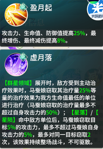 马蚕娘的绝技可以对敌方全体发动多段攻击,并展开持续3个大回合的【群星领域】。该领域可通过技能延长持续时间,并触发【星落】和【星陨】效果。每次【星落】对敌方单体造成真实伤害,而【星陨】则对全体造成伤害。此外,马蚕娘还可以窃取敌方的治疗效果,用于恢复我方血量最低的单位。这个设计使她在战斗中能够有效压制敌方,同时为队伍提供持续治疗。