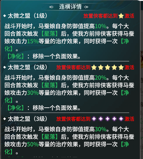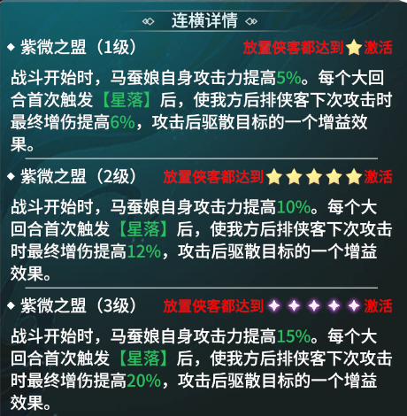 紫微之盟主要提升攻击力,适合进攻性阵容。首次【星落】后的增伤效果,使后排输出侠客能更有效地打击敌方关键角色。驱散效果也提供了对敌方增益技能的反制手段,使得队伍在进攻时能更具压制力。