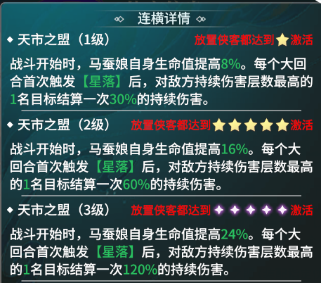天市之盟提供额外生命值加成,提升了马蚕娘的生存能力。通过对敌方持续伤害层数最高目标的结算,能够有效消耗敌方的关键单位,适合打消耗战和需要逐步削弱对手的策略。